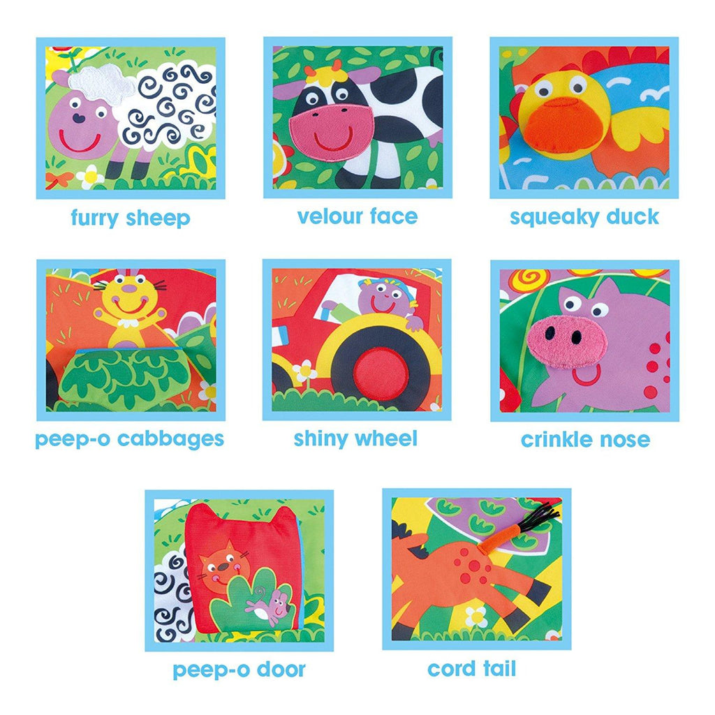 Anello gonfiabile con rivestimento in tessuto e 8 attività multisensoriali sul bordo. Rivestimento lavabile in lavatrice.