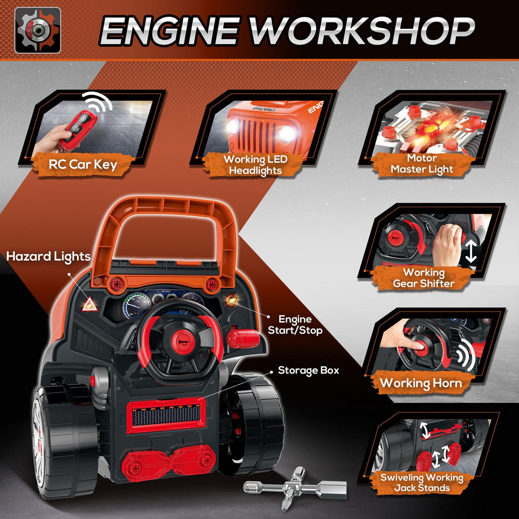- OFFICINA GIOCATTOLO: I tuoi bambini potranno scoprire come funziona un motore. Aprendo il cofano possono controllare l'olio, sostituire freni a disco, sostituire le candele, riparare i fari, togliere il motore giocattolo e molto altro.