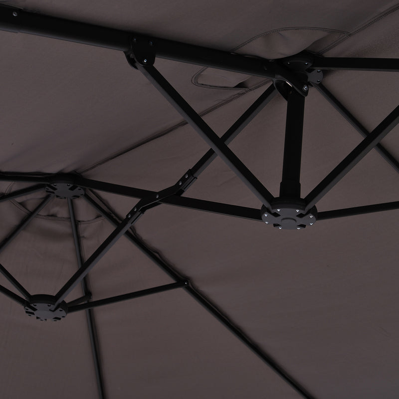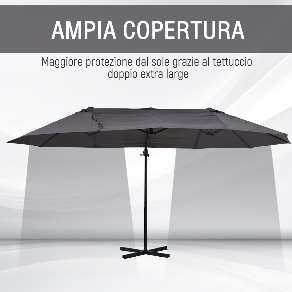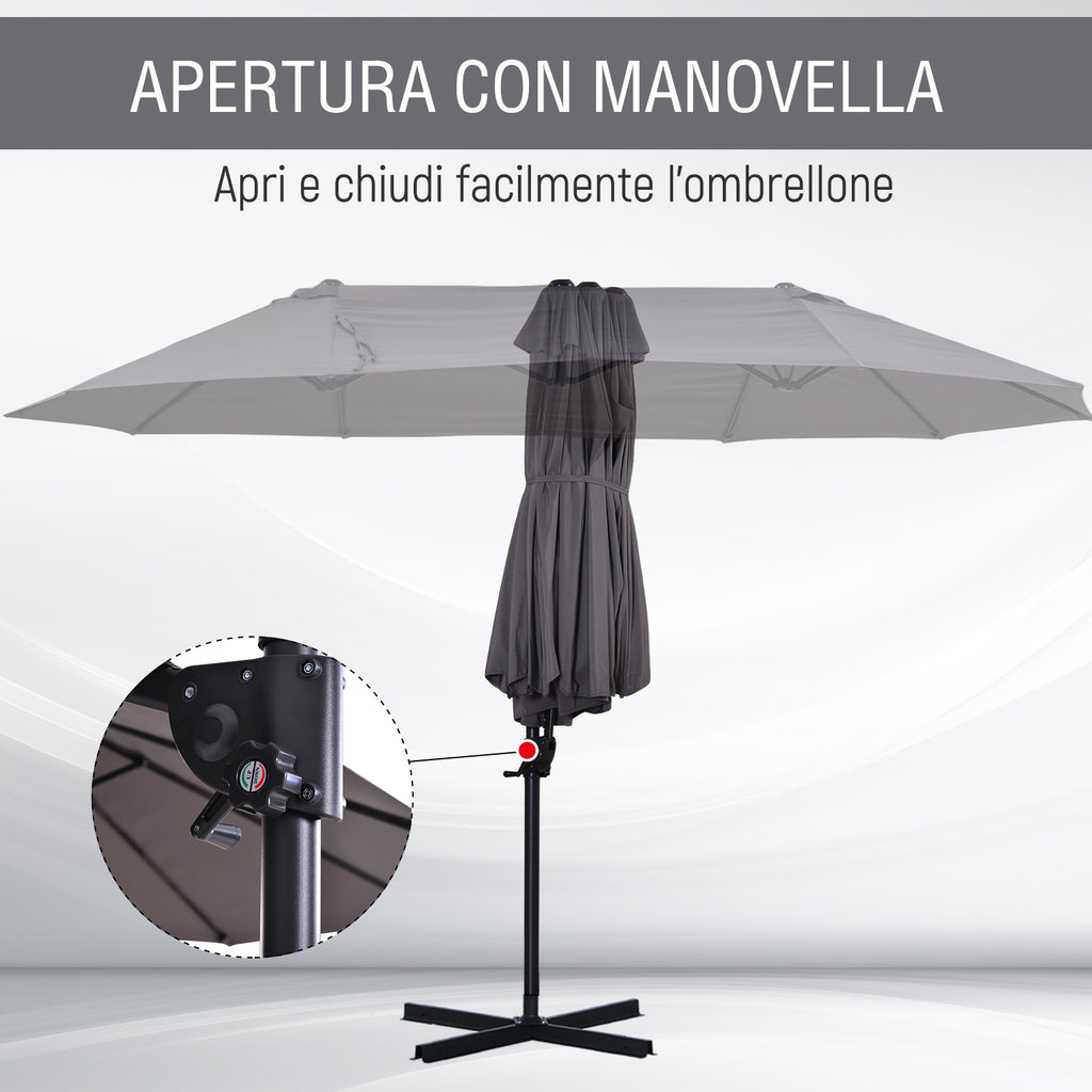 Questo ombrellone doppio è la scelta perfetta per riparare dal sole un ampio spazio, ad esempio i tavoli di un bar, il cortile o il parco. Il tettuccio è costruito in poliestere in grado di bloccare i raggi UV, mentre il telaio è costruito in acciaio antiruggine ed è sostenuto da 12 stecche per offrirti il massimo della stabilità . Grazie alla manovella puoi aprire e richiudere facilmente l'ombrellone in base alle tue esigenze. La vita va vissuta all'aperto insieme ad !
