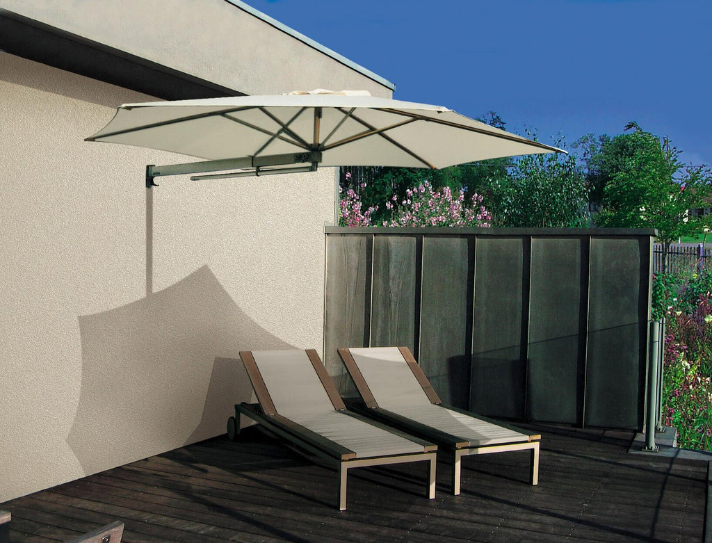 Ombrellone da Giardino Parrot P3con braccio telescopico da applicare alla parete. Il braccio si può allungare da mt 1,40 a mt 1,80, può ruotare orizzontalmente. Si sgancia velocemente dal supporto a muro, molto resistente e maneggevole.