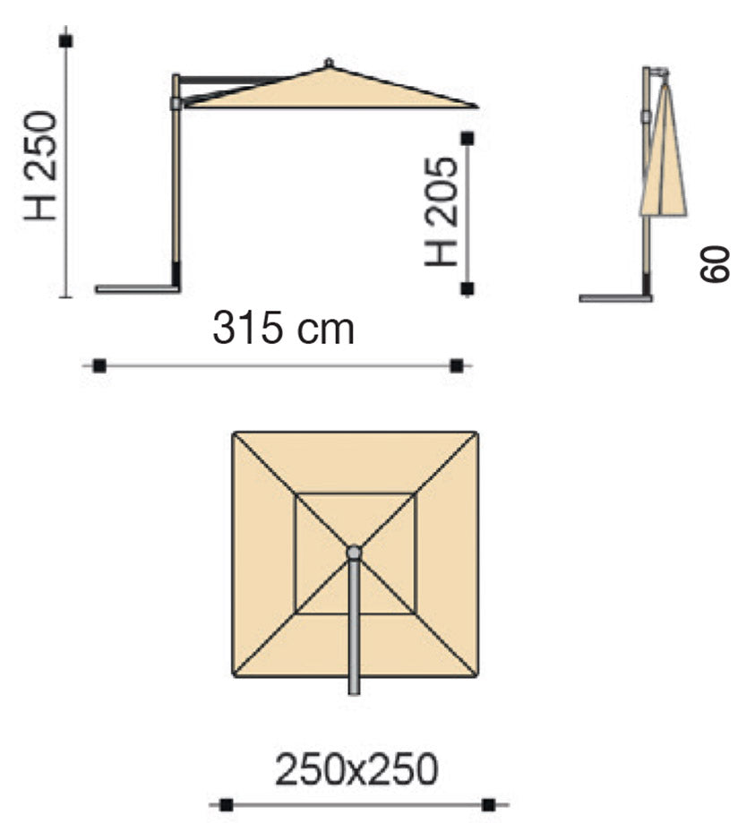 Ombrellone laterale retrattile e compatto con telaio palo alluminio effetto legno, struttura colore grafite, apertura senza corde e/o manovelle, girevole, base a T, tessuto PolyMa idrorepellente.