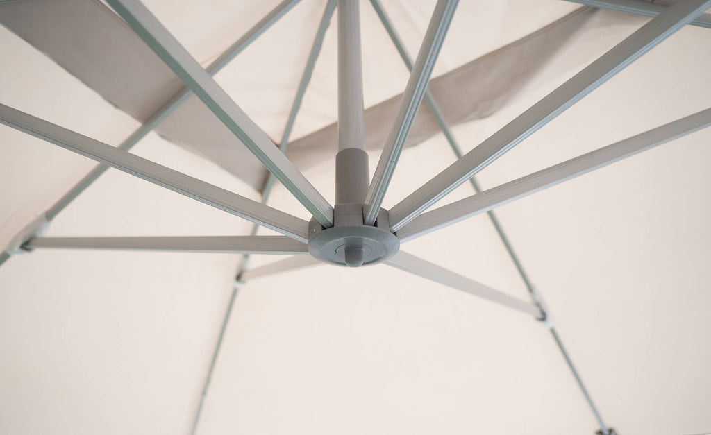 Dal design minimal ed elegante questo ombrellone è realizzato con una solida struttura in alluminio verniciata a polvere, palo laterale con impugnatura per proiettarlo in 5 posizioni e la pedalina per ruotarlo a 360° in modo da scegliere la posizione in base alle proprie necessità. Telo color grigio in poliestere e acrilico 250 g/m2. Base laterale completamente in acciaio durevole nel tempo e resistente agli agenti atmosferici. Predisposizione lampada led. Ideale per tenersi al riparo dal caldo estivo creando piacevoli zone d'ombra. Un ombrellone da giardino è la soluzione perfetta per completare l'arredo outdoor inoltre grazie alla struttura con palo decentrato riesce ad ottimizzare ogni tipo di spazio.