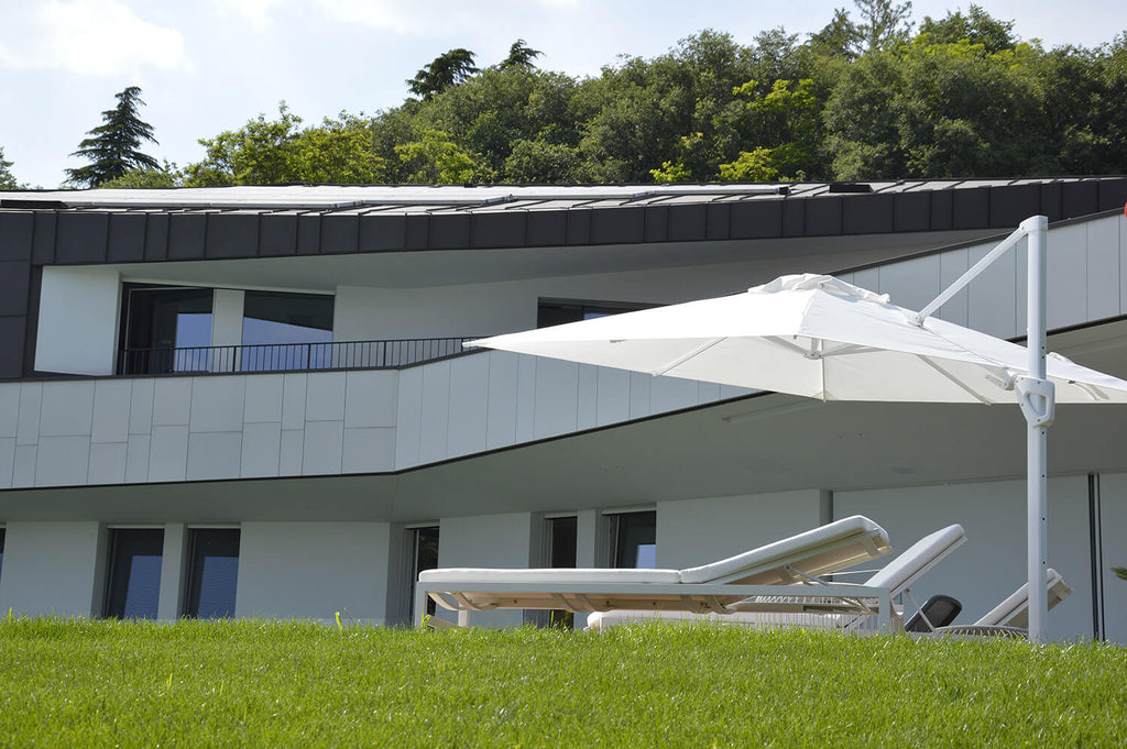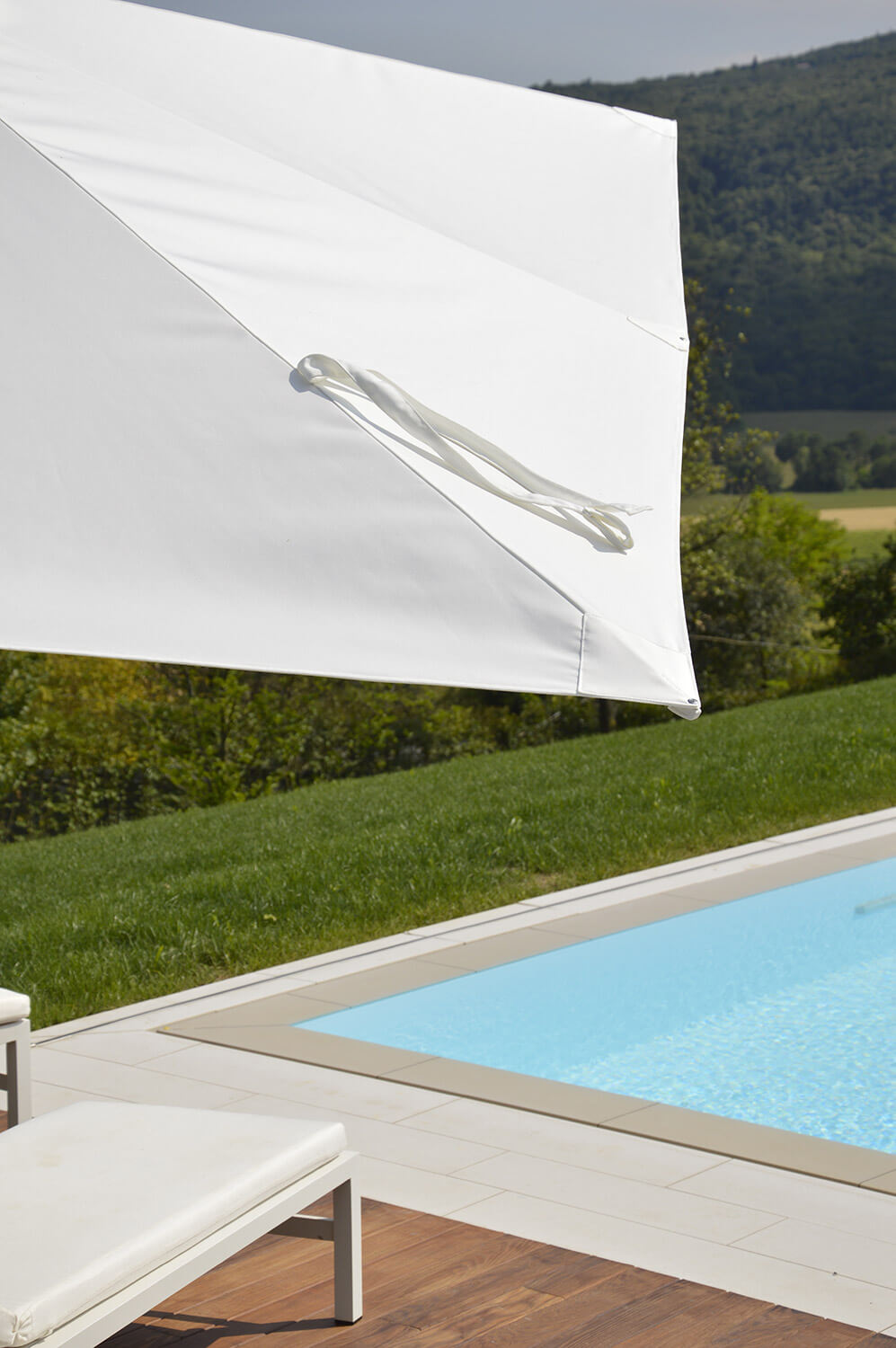 JAZZ, l'ombrellone in alluminio inclinabile anche lateralmente, da esterno in alluminio con struttura a braccio laterale e telo in Poliestere.