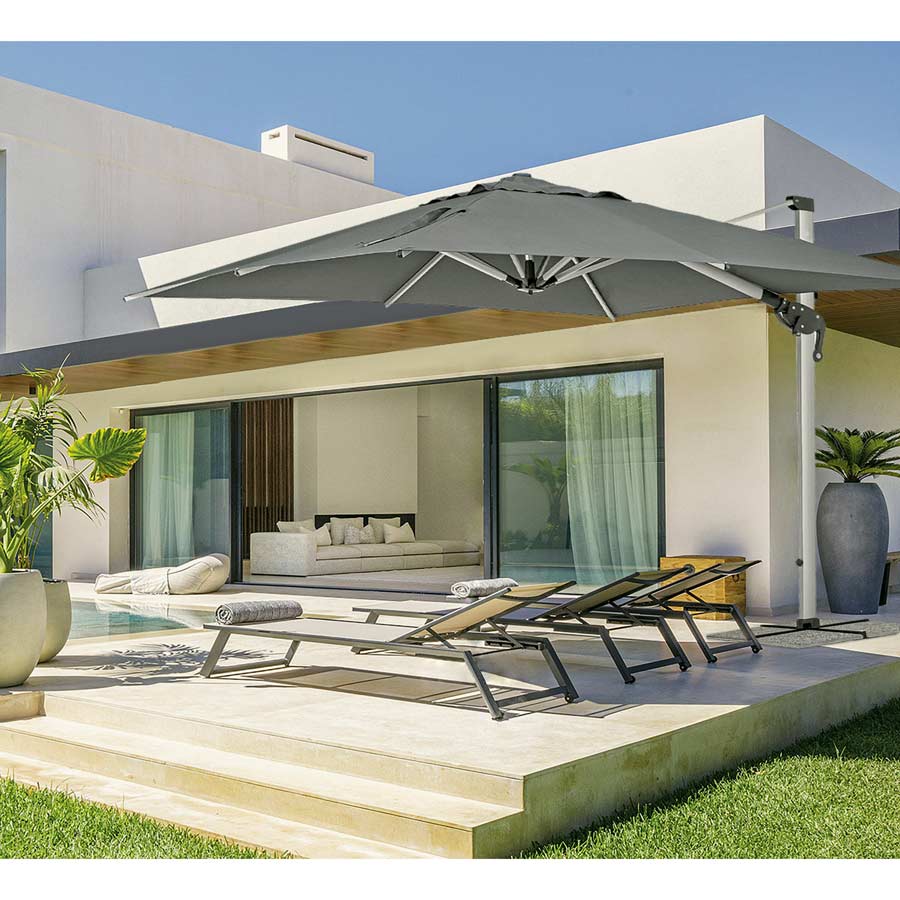 L'ombrellone Roma 3x4 palo 93x57 Grigio è un prodotto esclusivo che offre una nota particolare per i tuoi spazi all'aperto. La caratteristica di questo prodotto è la capacità di offre ancora più ombra a seconda di come viene direzionato.La modalità di rotazione a 360°, consente di manipolare facilmente il telo l’ombrellone nella direzione prescelta. Grazie a questa sua preziosa caratteristica, il design Roma è la linea di ombrelloni da giardino con braccio laterale maggiormente scelta tra i prodotti arredamento per esterni.