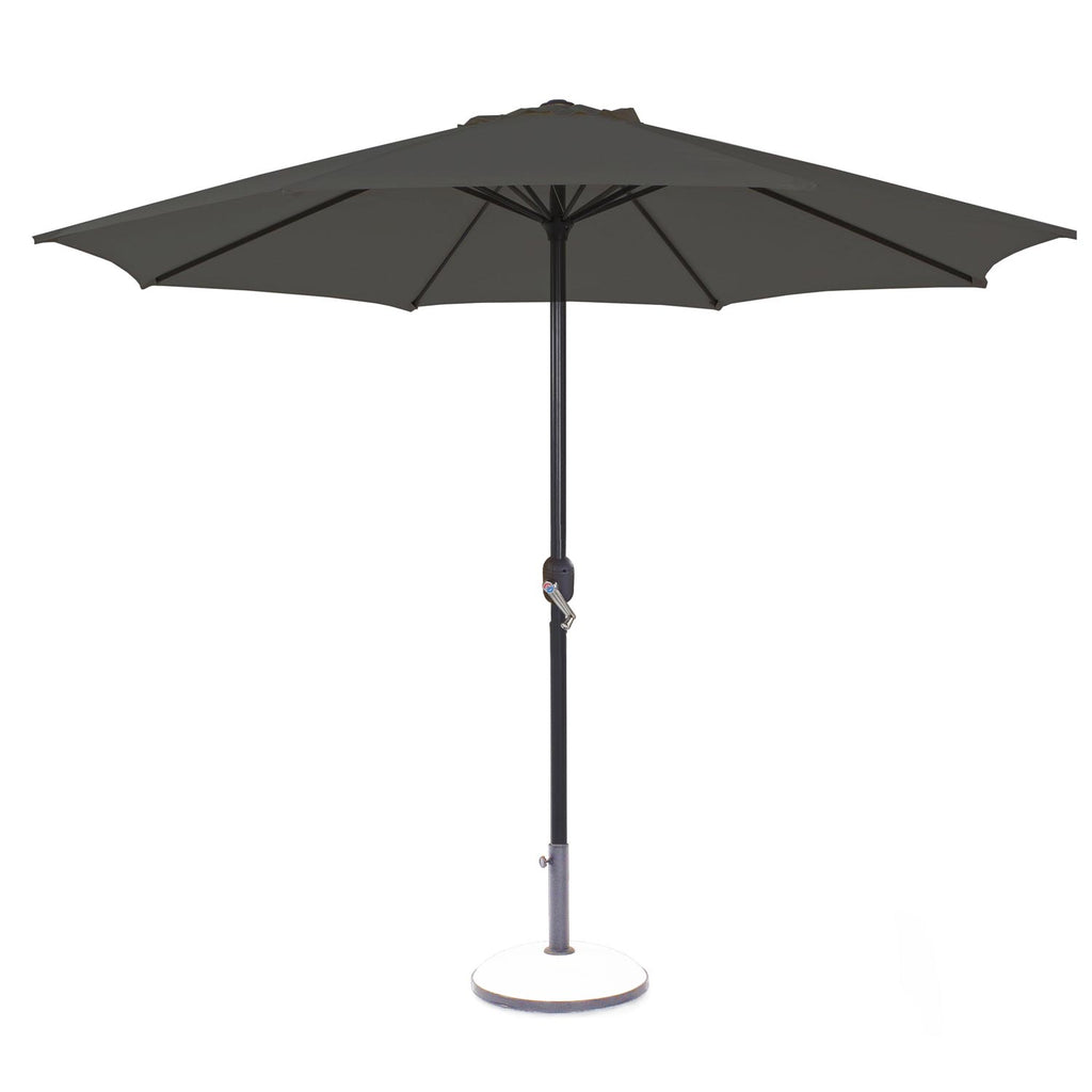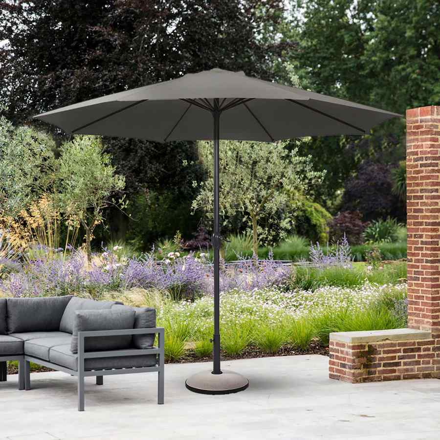 L'Ombrellone Kela Grigio ha un telo circolare del diametro di 2.70 m, sorretto da una struttura solida e di colore grigio.