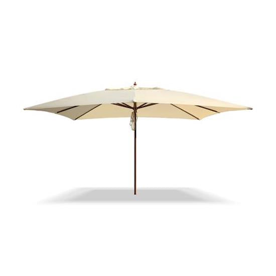 Ombrellone rettangolare con sistema di apertura/chiusura a doppia carrucola, 8 stecche, ventilazione.Palo e stecche in legno (Hardwood) verniciato tonalità Teak, tessuto Poliestere gr. 235/mq. con trattamento idrorepellente,