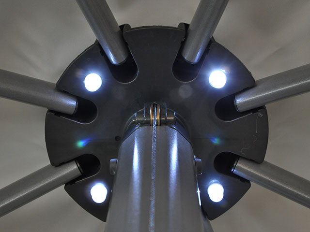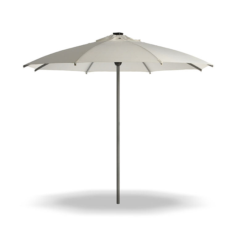 Ombrellone rotondo con sistema di apertura/chiusura automatica, pannello solare integrato per mantenere la carica delle batterie necessarie per l'apertura/chiusura e luci Led, telecomando per apertura/chiusura incluso.Struttura in Alluminio, 8 stecche, tessuto Poliestere gr. 250/mq.