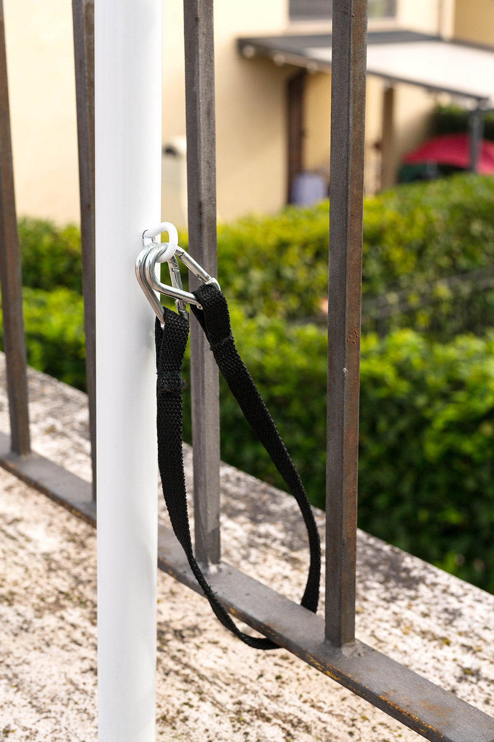 - Accessorio in acciaio con protezioni in plastica per ancoraggio a ringhiera