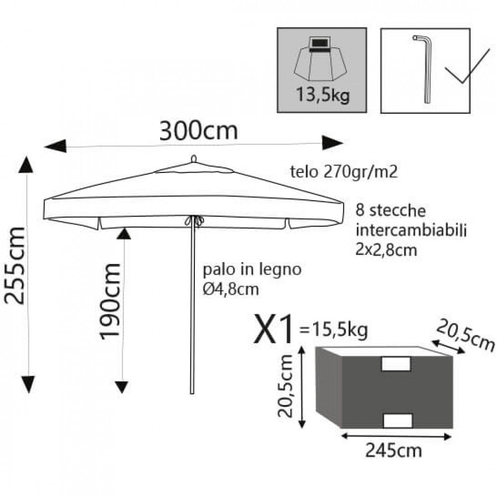 Ombrellone da Giardino Ø3 m Palo Ø48 mm Venere in Legno Marrone