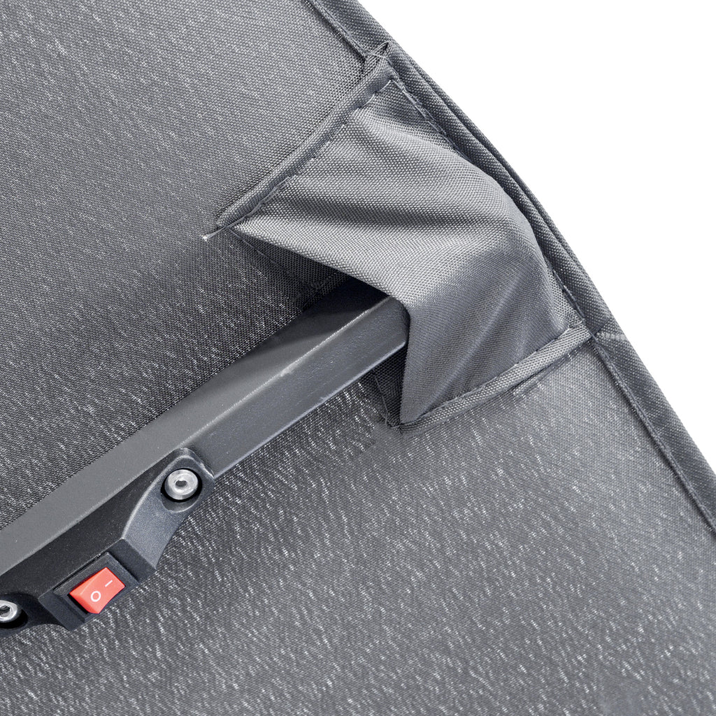 L'ombrellone doppio quando cala il buio, illumina le tue serate con le luci LED sulle stecche. Le luci sono alimentate con un pannello solare, così risparmi e non hai bisogno di elettricità. Si apre e chiude facilmente grazie alla manovella posizionata sul palo e puoi inclinare il tettuccio per ripararti dal sole a ogni angolazione. Continua la tua giornata anche di notte sotto questo ombrellone!