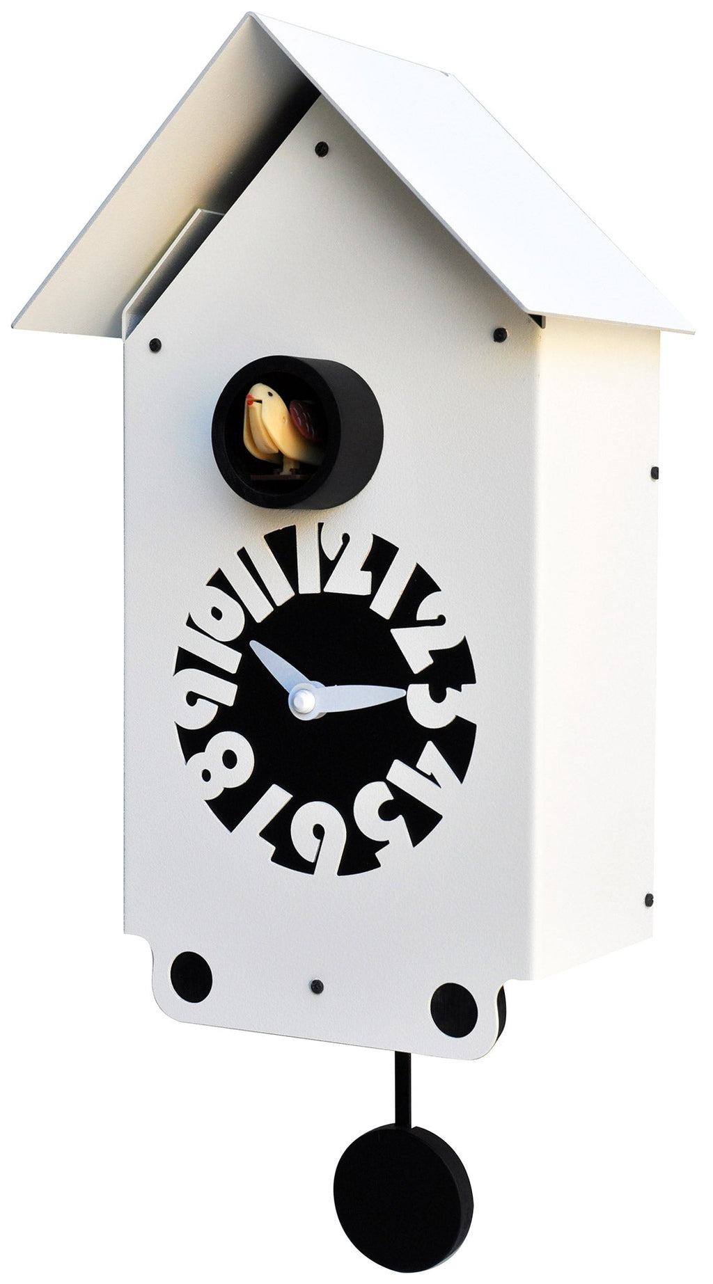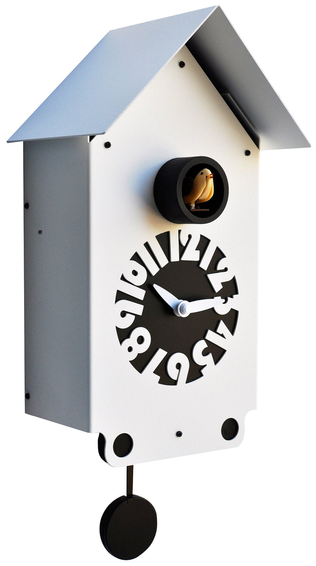 Orologio a cucù con cassa in metallo laccata bianca e quadrante in betulla laccato nero.