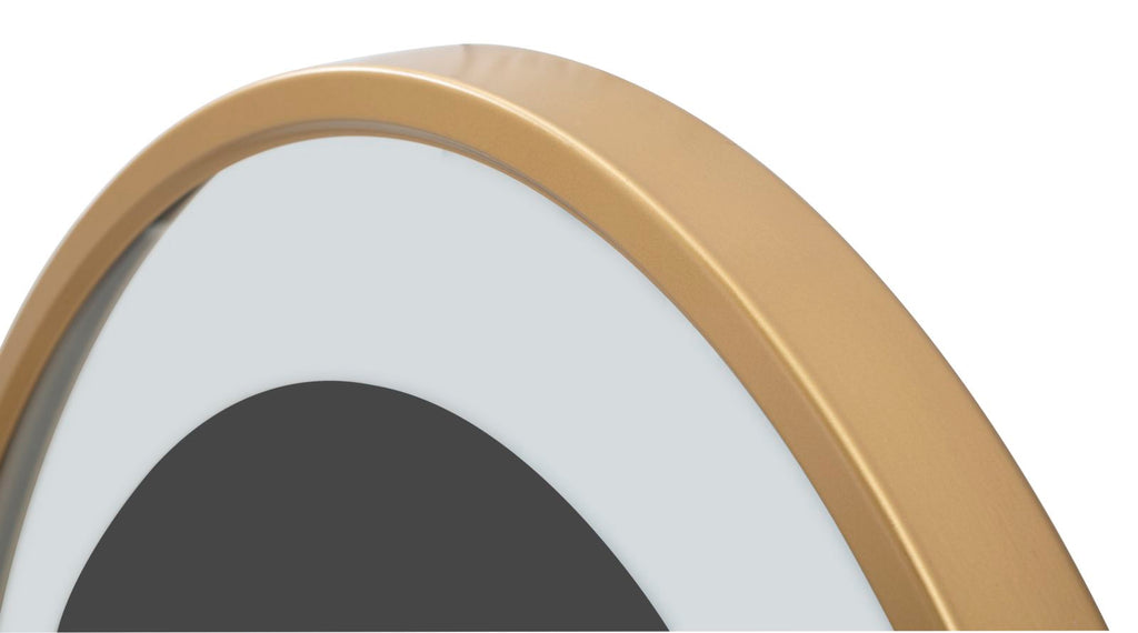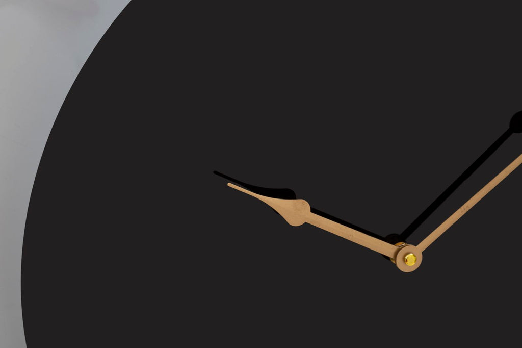 Elegante orologio rotondo da parete dal design semplice ma sofisticato. L'eleganza del nero e dell'oro si fondono per creare una combinazione di classe.