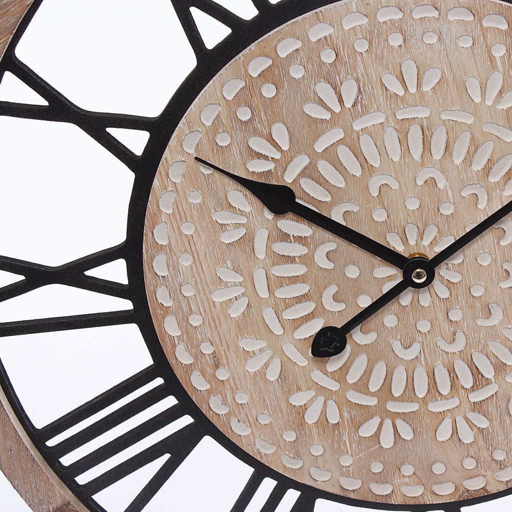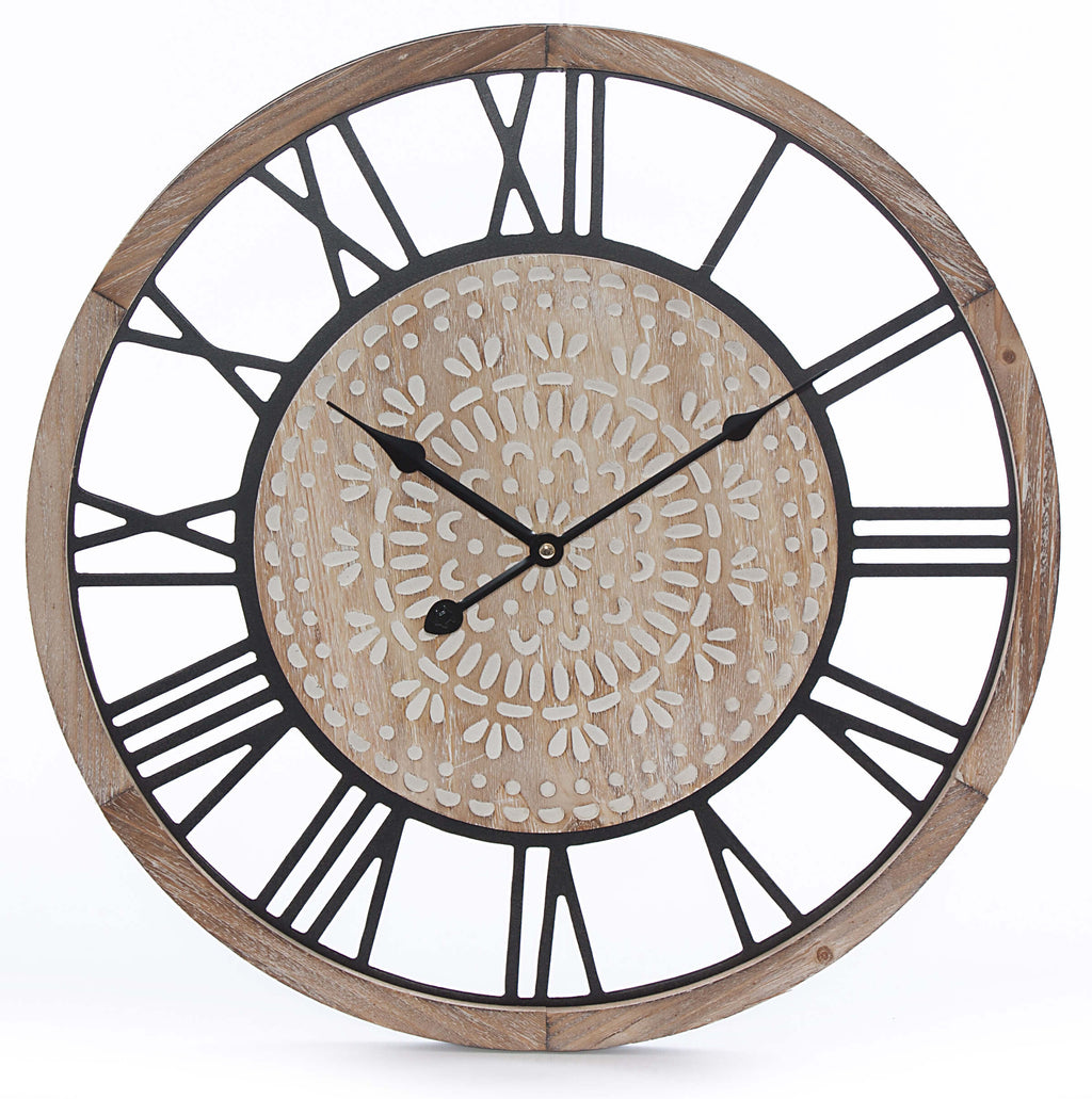 Orologio rotondo da parete in legno con decorazione nel quadrante centrale. 1 batteria richiesta, tipo AA, non è inclusa. Consegna senza materiale di fissaggi.