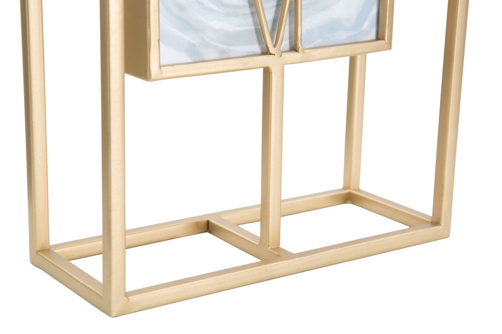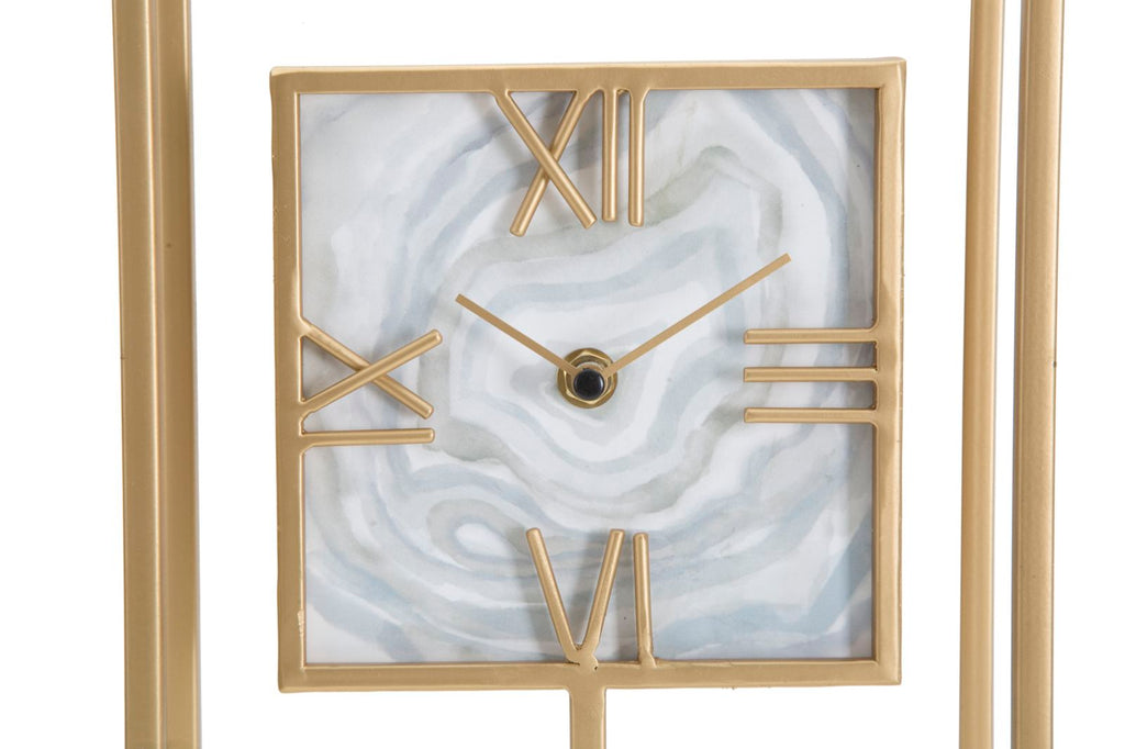 Orologio rettangolare da tavolo dalle linee semplici e pulite. Il quadrante che richiama la madreperla unito all'oro creano un contrasto elegante e delicato.