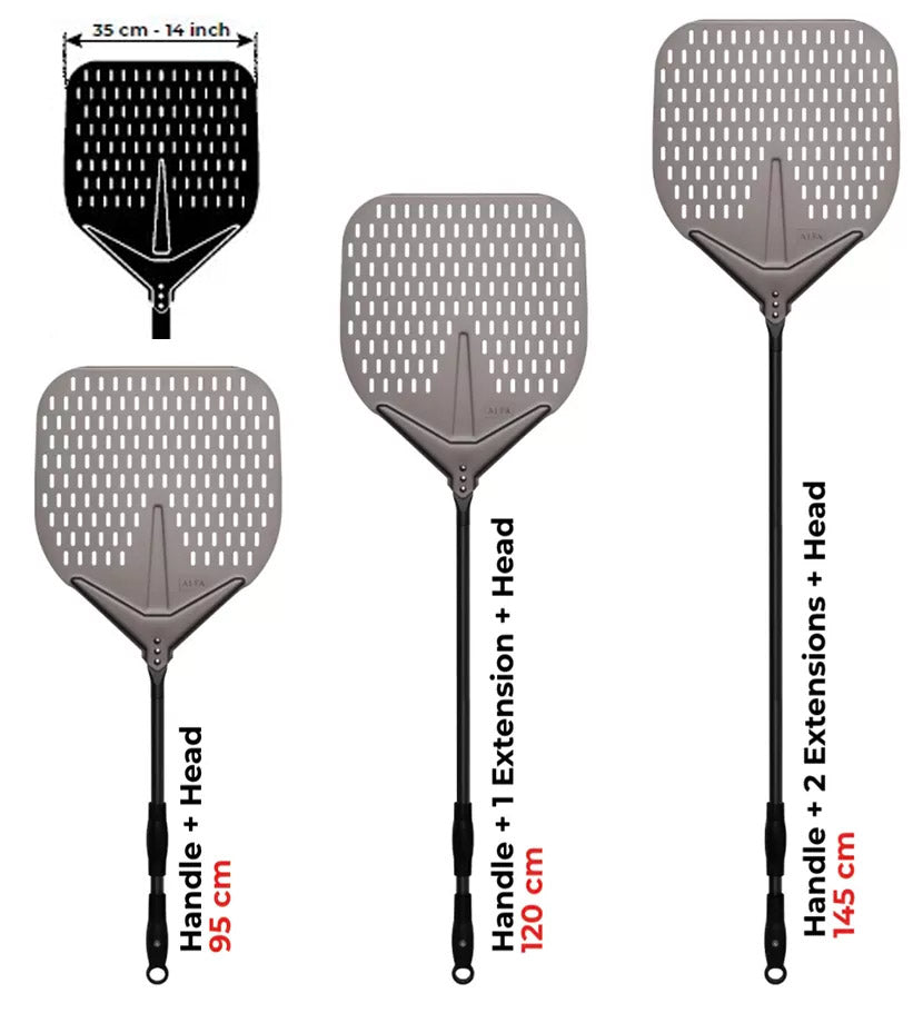 La lunghezza della pala per pizza Alfa può quindi essere modificata di volta in volta, scegliendo tra 95 cm (manico + testa), 125 cm (manico + 1 prolunga + testa) o 145 cm (manico + 2 prolunghe + testa).