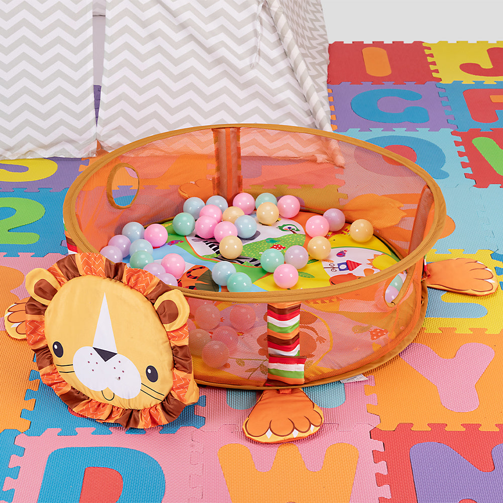 Ma ciò che rende davvero particolare questa bellissima palestrina è la sua trasformazione in box recinto, infatti basterà alzare la comoda rete che circonda illeoncino per trasformare il tappeto in un comodo box gioco, inoltre la testa del leone è fornita di un set di palline per trasformare il box in una divertentissima piscina di palline colorate.