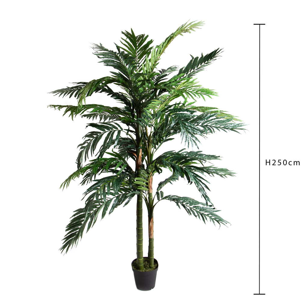 Palma per 3 rami H.250 Cm - Caratteristiche- Ha la stessa freschezza naturale ed effetto decorativo di una vera pianta e conserva la sua bellezza anno dopo anno, non ha bisogno di cure.-Ha un aspetto elegante e raffinato, estremamente realistico e naturale, quasi da sembrare vero anche al tatto.-Realizzato con prodotti di ottima qualità, adatti per uso esterno e completamente lavabili.-Pulizia:La pulizia può essere semplicemente fatta spolverando con un piumino e con un panno asciutto oppure lavando il prodotto con acqua. Potrà tornare a splendere come nuovo ancora per molto altro tempo.