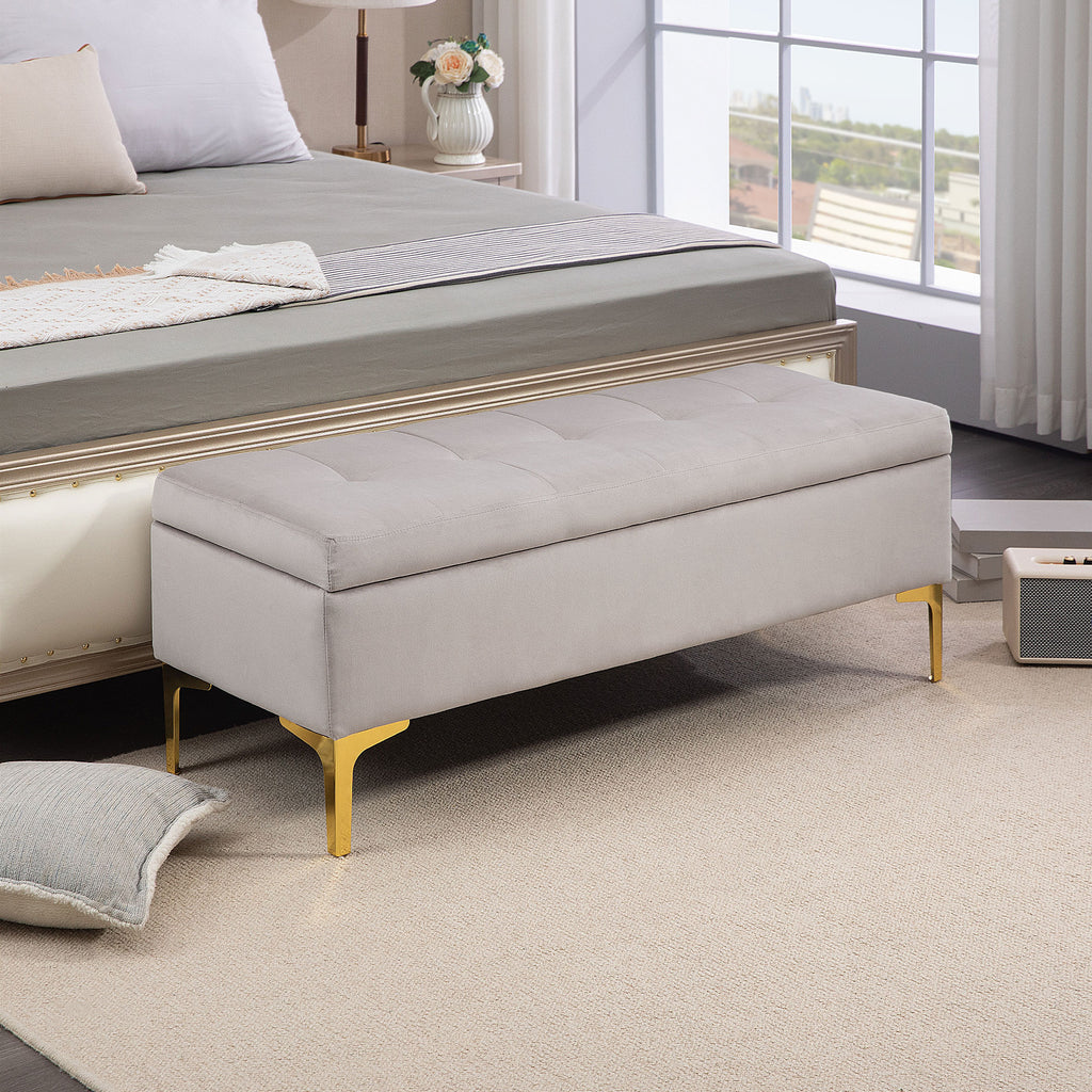 Panca Contenitore Fondo Letto 120x44x44,5cm con Tessuto Vellutato e Gambe Dorate Grigio Chiaro