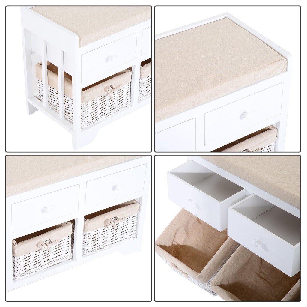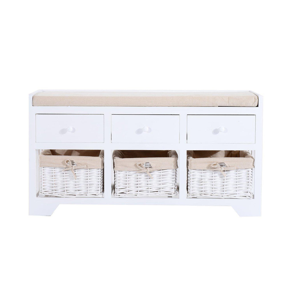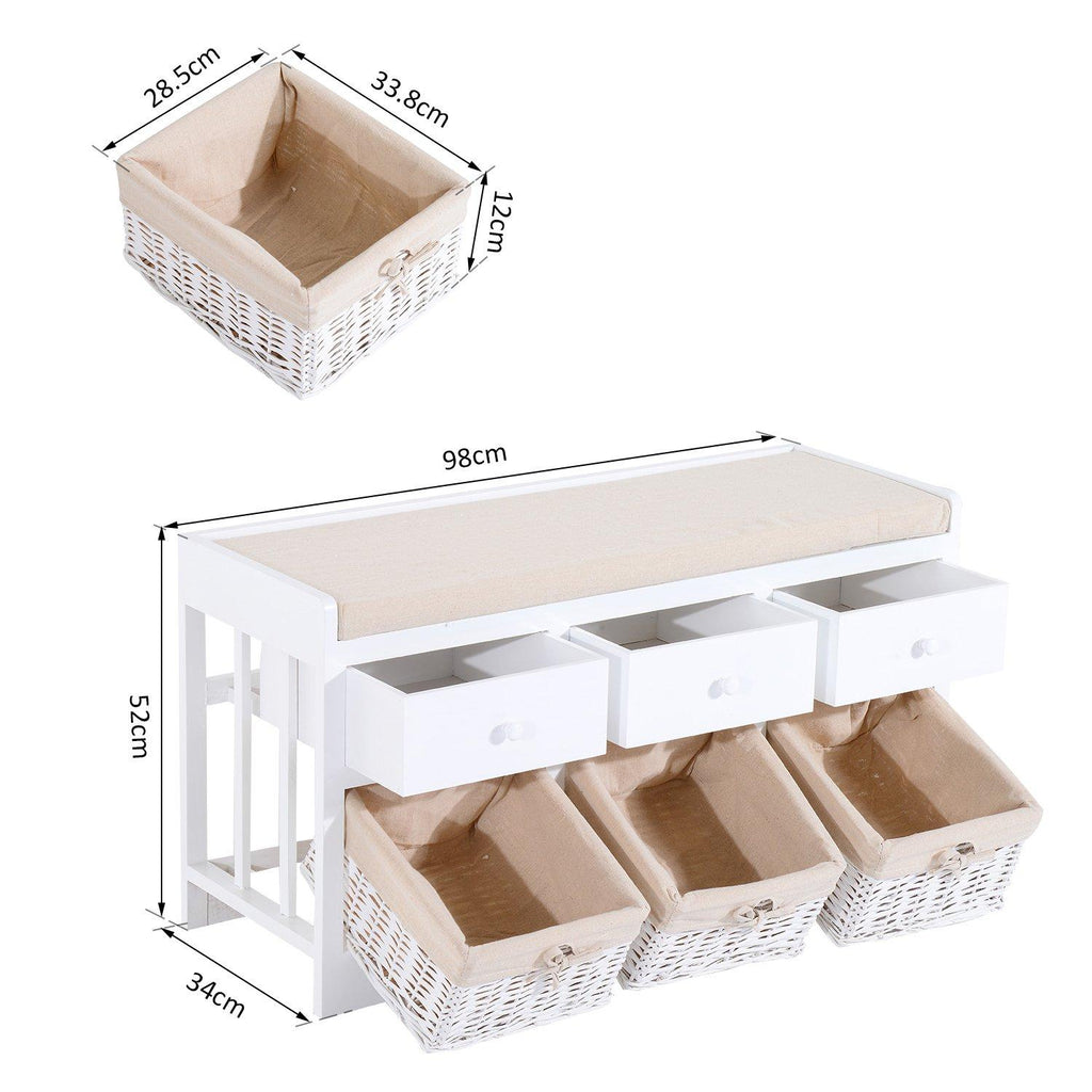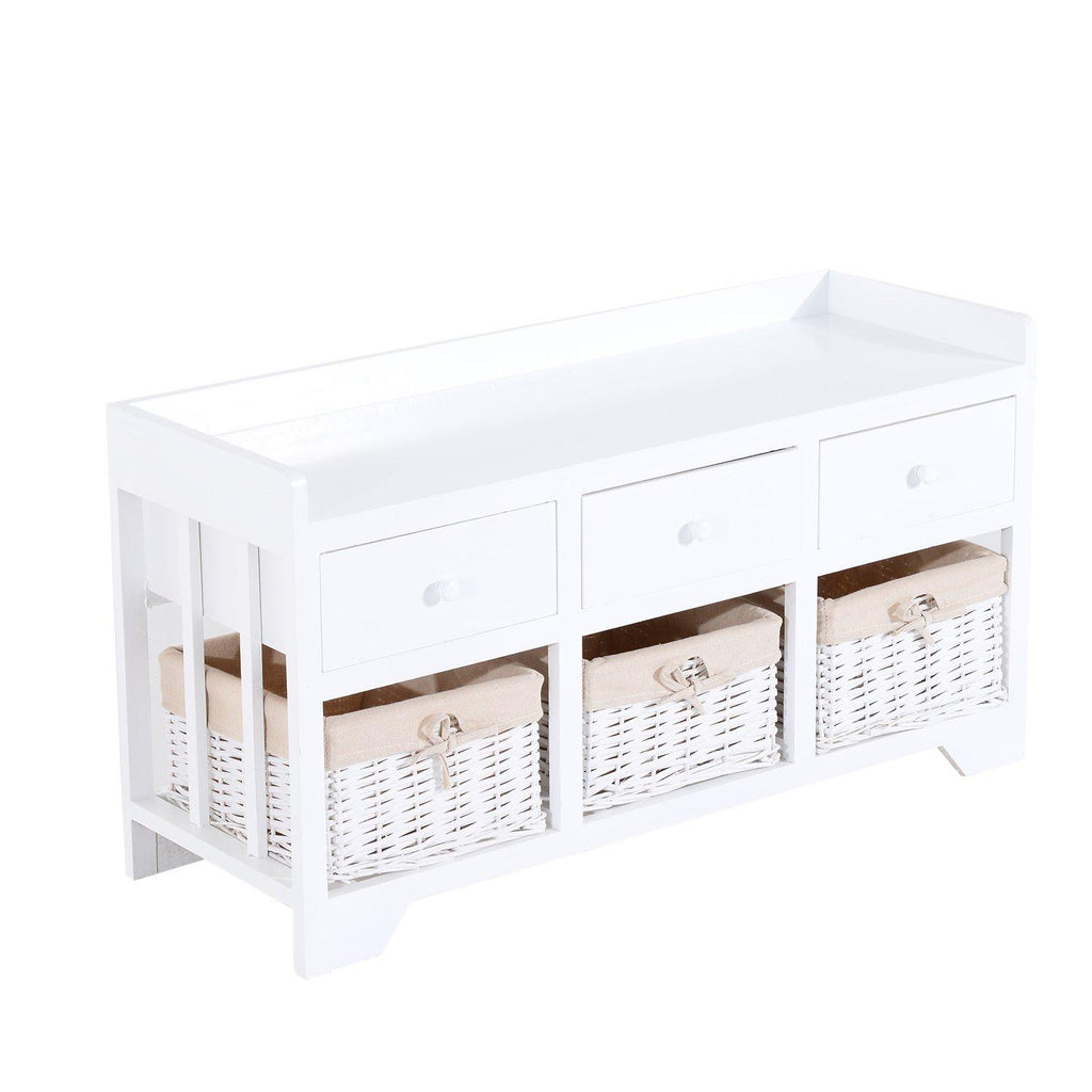 Panca Contenitore in Legno con Cassetti e Ceste in Vimini Bianco 98x34x52 cm
