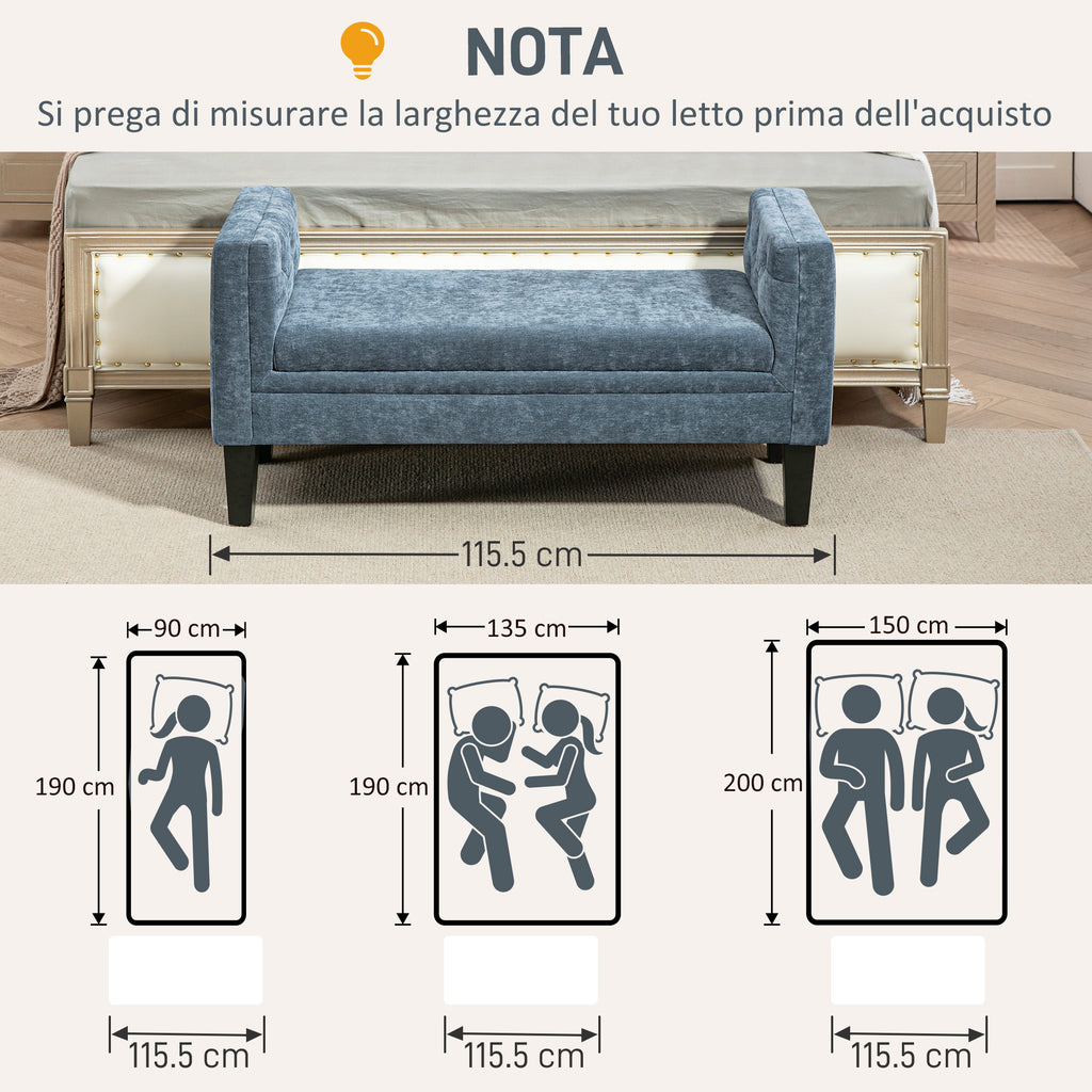 Panca Fondoletto Braccioli Trapuntati e 2 Cuscini 115,5x45x56 cm in Ciniglia e Legno Grigio-Blu e Nero