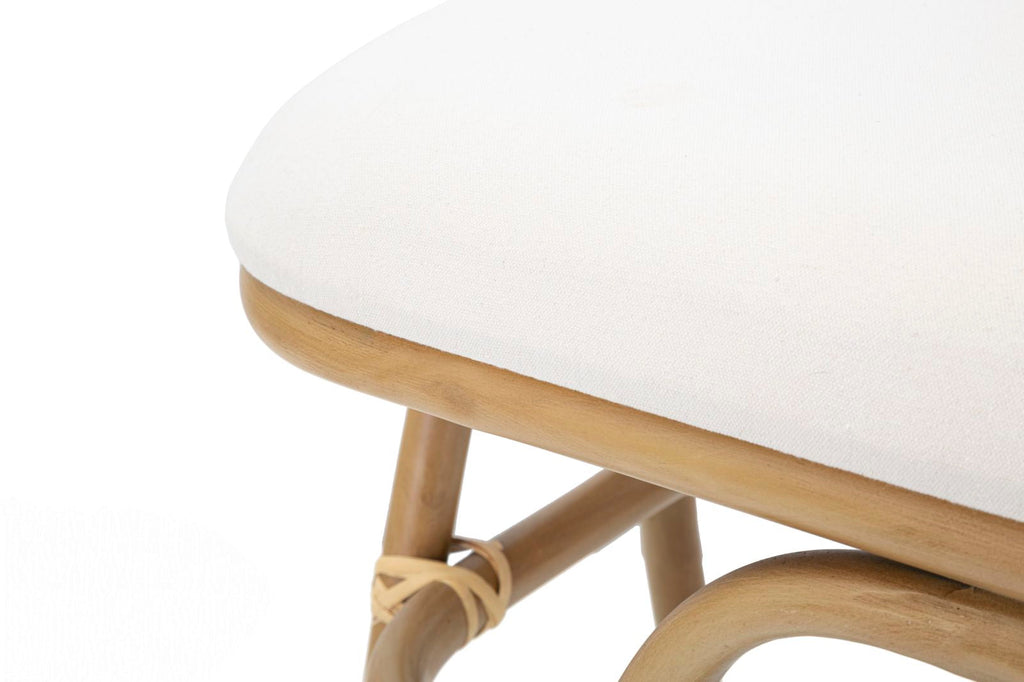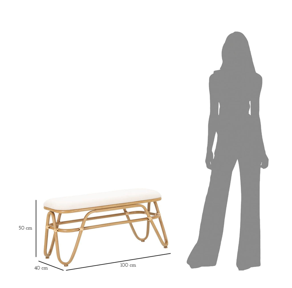 - Panca Panama: metallo con finiture rattan, seduta imbottita in tessuto bianco, design semplice e versatile