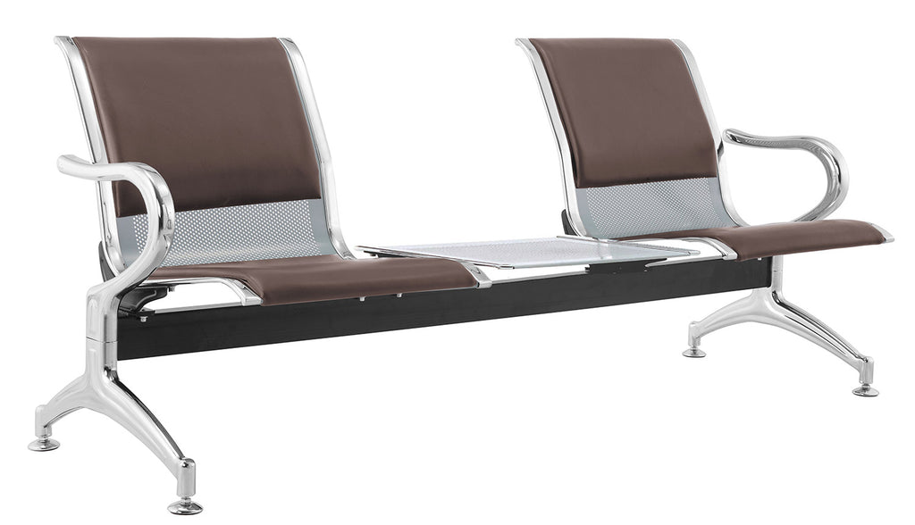 Panca per Sala Attesa 2 Posti da Ufficio con Cuscino e Tavolino in Acciaio e Similpelle Argento/Marrone Scuro