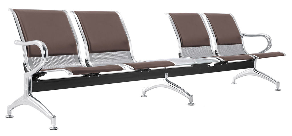 Panca per Sala Attesa 4 Posti da Ufficio con Cuscino e Tavolino in Acciaio e Similpelle Argento/Marrone Scuro