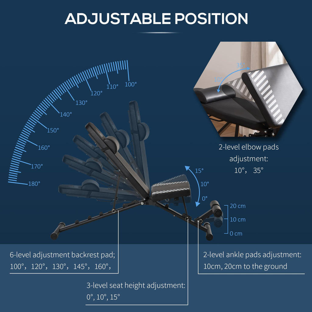- REGOLABILE: Inclina lo schienale e la seduta per allenarti in totale comodità! Questa panca pesi, infatti, ha uno schienale regolabile su 6 livelli (100°, 120°, 130°, 145°, 160°, 180°), la seduta regolabile su 3 livelli (0°, 10°, 15°) e l'altezza delle cavigliere regolabile su 2 livelli (10cm o 20cm di distanza da terra).