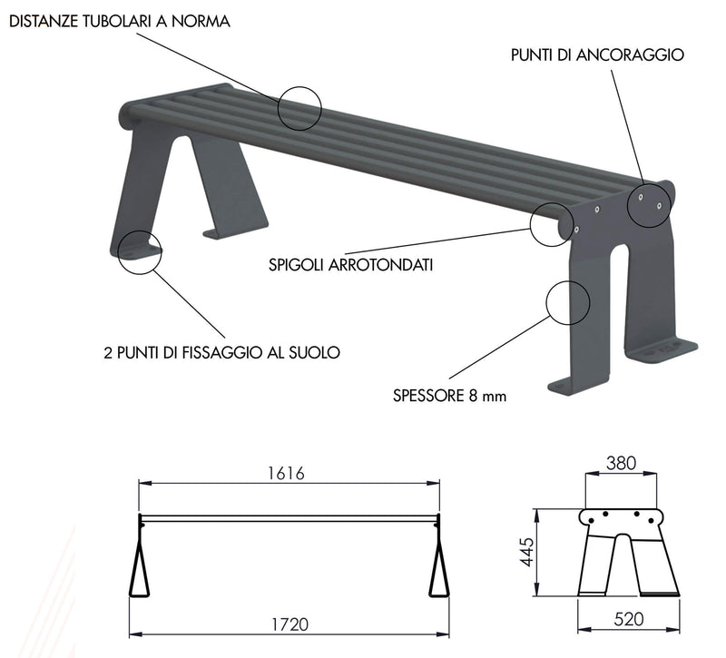 - Fissaggio al Suolo con Viti Autofilettanti M8x120 mm, Rondelle Ø 8 mmx24 mm, Tasselli ad Espansione Ø 16 mmx120 mm (Inclusi)