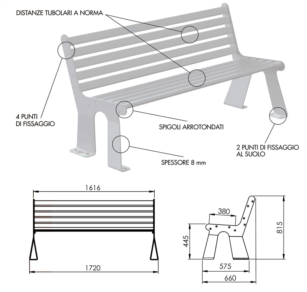 La struttura di questa panchina è realizzata in acciaio zincato a caldo, che garantisce una lunga durata e richiede una minima manutenzione. Viene fornita smontata in kit, composto da seduta, schienale e fianchi. Ogni kit è completo di accessori di montaggio, di fissaggio al terreno e di un manuale di istruzioni. Questa panchina è ideale per essere utilizzata in parchi pubblici, giardini privati, aree comuni condominiali, percorsi pedonali e ciclabili, passeggiate in lungomare, centri storici e piazze. Con le sue dimensioni offre un ampio spazio per rilassarsi e riposare all'aperto, portando la comodità di casa in spazi esterni.