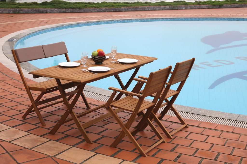 Panca pieghevole a 2 posti in legno di acacia con cuscini in poliestere 180gr. Complemento d'arredo per giardini o terrazze.