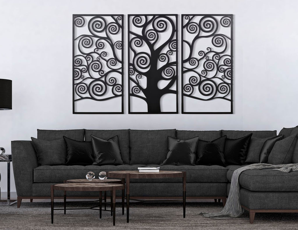 Set di 3 pannelli decorativi 3D in metallo nero. Il particolare disegno ad albero dona un tocco di classe con richiami alla natura ed alle origini della vita.