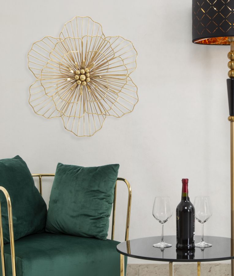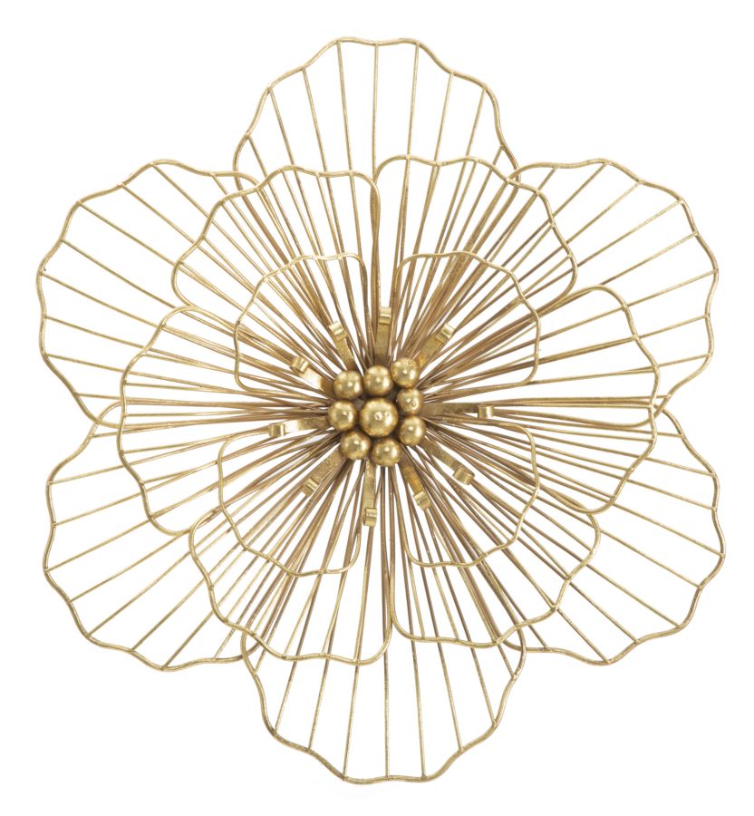 Pannello fiore in metallo dorato. I pannelli 3D sono il nuovo trend per decorare le pareti. Il metallo si declina in forme geometriche, vegetali o animali che conferiscono un'allure glamour e sorpendente ad ogni ambiente