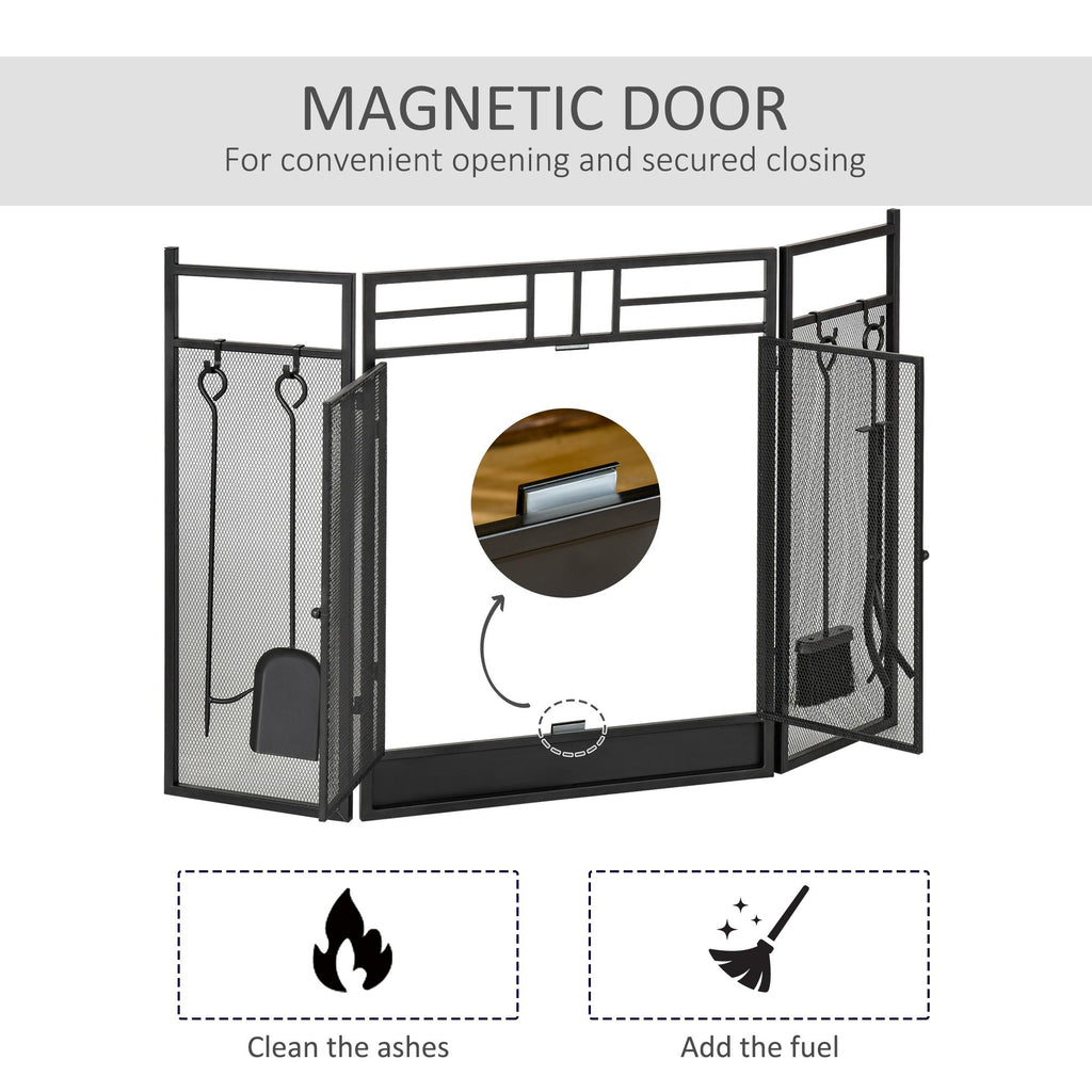 - CON PORTA E ACCESSORI: Questo parascintille ha una porta con chiusura magnetica e include 4 accessori (scopina, attizzatoio, paletta e pinza) e 4 ganci su cui appenderli.