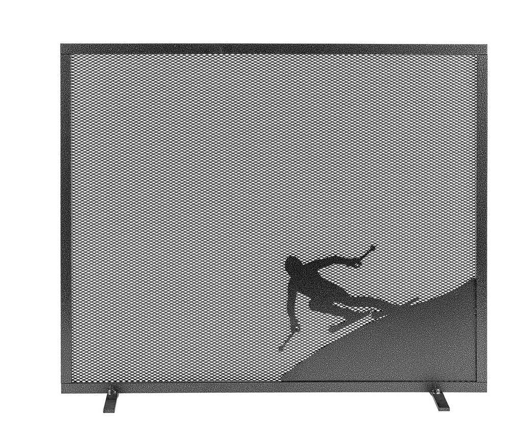 Parascintille per Camino a 1 Anta Design Sciatore 60x51 cm in Ferro Verniciato Grigio Martellato