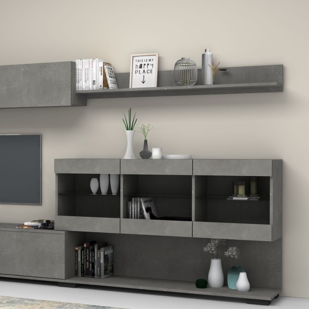 Parete attrezzata cemento beton Aktif 280x180 cm La parete è cosi composta modulo anta a ribalta con divisorio interno, modulo vano a giorno, 3 vetrine pensili con ripiani in vetro, pensile con anta a ribalta con divisorio interno, mensola.