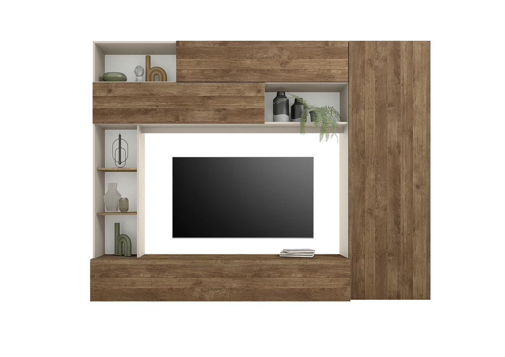 Pratiko: la tua parete attrezzata su misura. Con la sua combinazione unica di vani chiusi e aperti, la parete attrezzata Pratiko si adatta perfettamente a qualsiasi esigenza di spazio e stile. La finitura cashmere/mercure, ricercata e moderna, si sposa con qualsiasi tipo di arredamento, dal più industrial al più minimal. L'anta chiusa ti permette di nascondere ogni cosa garantendo un ambiente pulito ed organizzato.