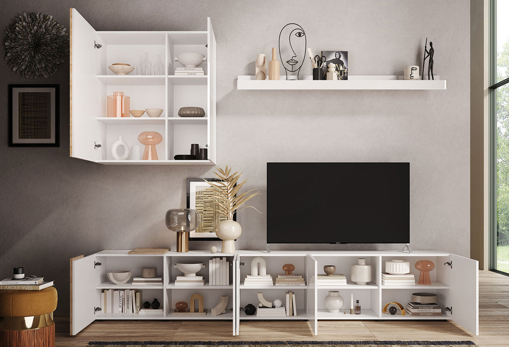 Parete attrezzata completa per il soggiorno. Combina stile e funzionalità. Include mobile TV, base con anta, pensile e mensola. Struttura robusta in legno, facile da montare. Personalizza il tuo living con questa soluzione versatile.