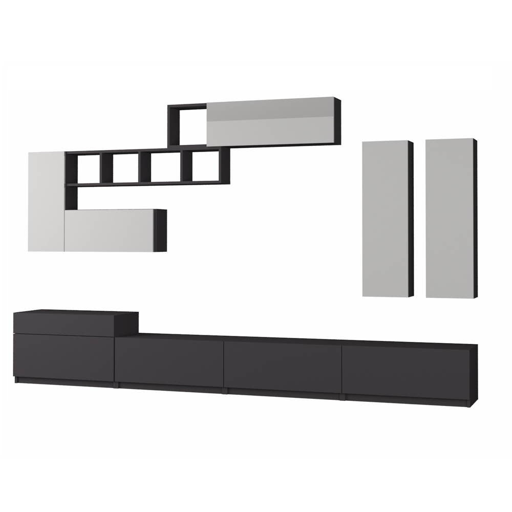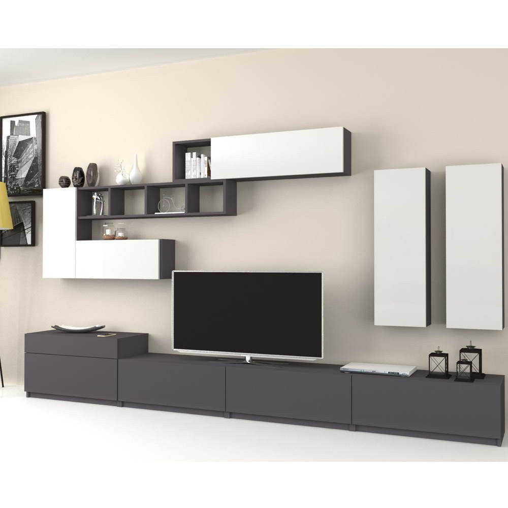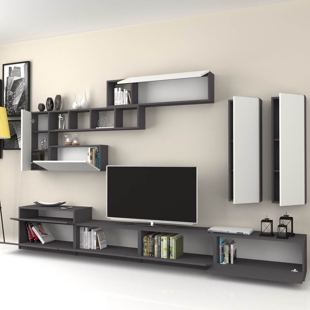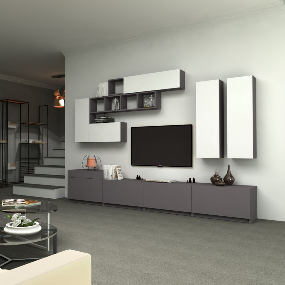 Generosa ed elegante parete attrezzata proposta nel moderno connubio di colori bianco e ghisa. Decisamente capiente, offre la possibilità di avere tanti vani con ante sia a ribalta che battenti, oltre a proporre vani a giorno per riporre libri e tanto altro. La parete è composta da 7 vano con ante a ribalta e 3 pensile con anta battente.