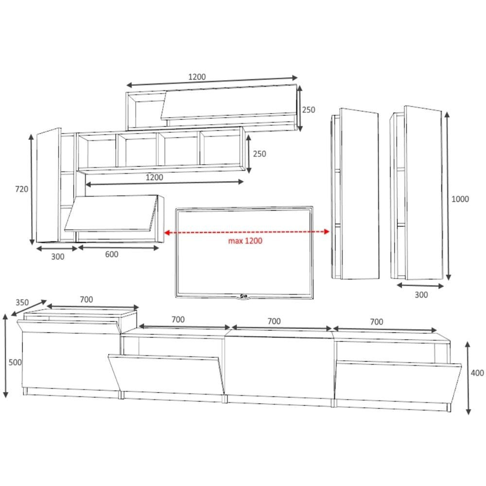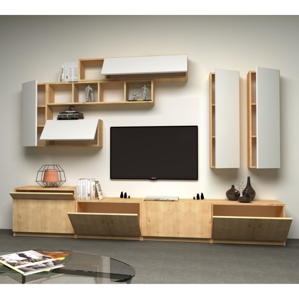 Parete attrezzata 280 cm bianco rovere Domino. Generosa ed elegante parete attrezzata proposta nel moderno connubio di colori bianco e rovere. Decisamente capiente, offre la possibilità di avere tanti vani con ante sia a ribalta che battenti, oltre a proporre vani a giorno per riporre libri e tanto altro. La parete è composta da 7 vano con ante a ribalta e 3 pensile con anta battente.