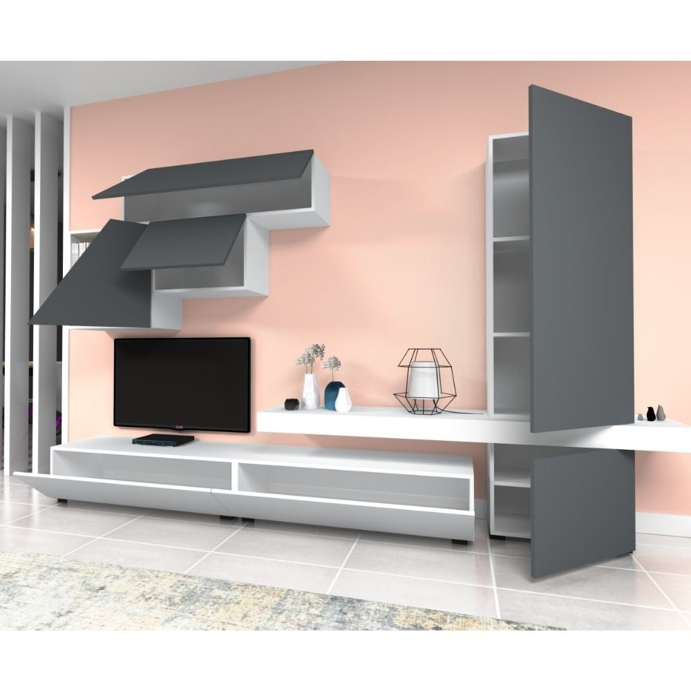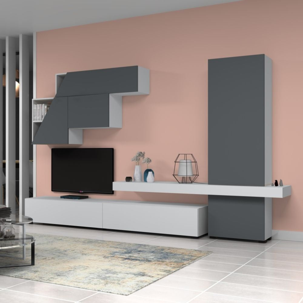 Parete attrezzata 335 cm bianco cemento Fitz. La Parete attrezzata 335 cm è composta da base con due ante a ribalta da 240 cm, colonna con anta e ripiani da 60 cm, una mensola da 180 cm disallineata, un pensile con anta da 120 cm, un pensile da 60x60 cm, un pensile con anta 60x40 cm.