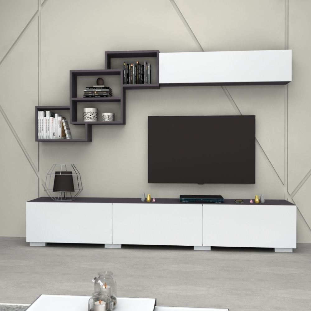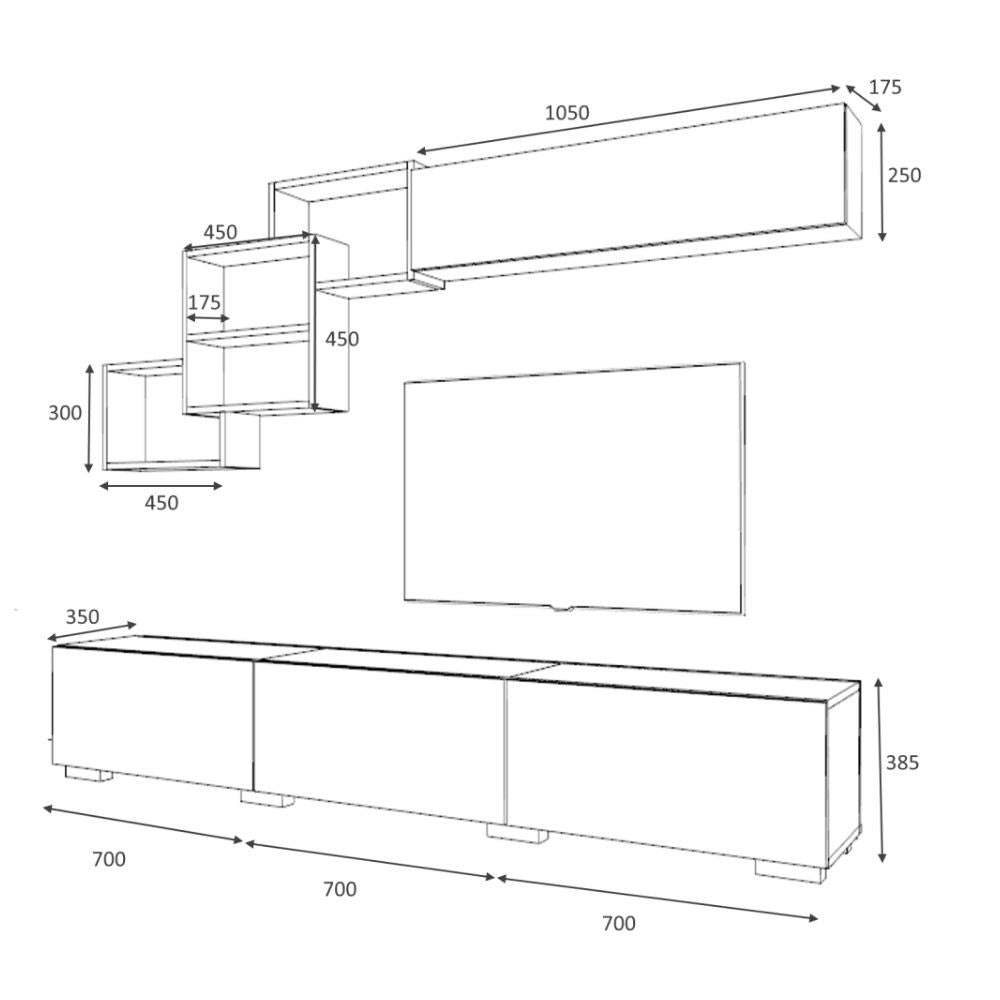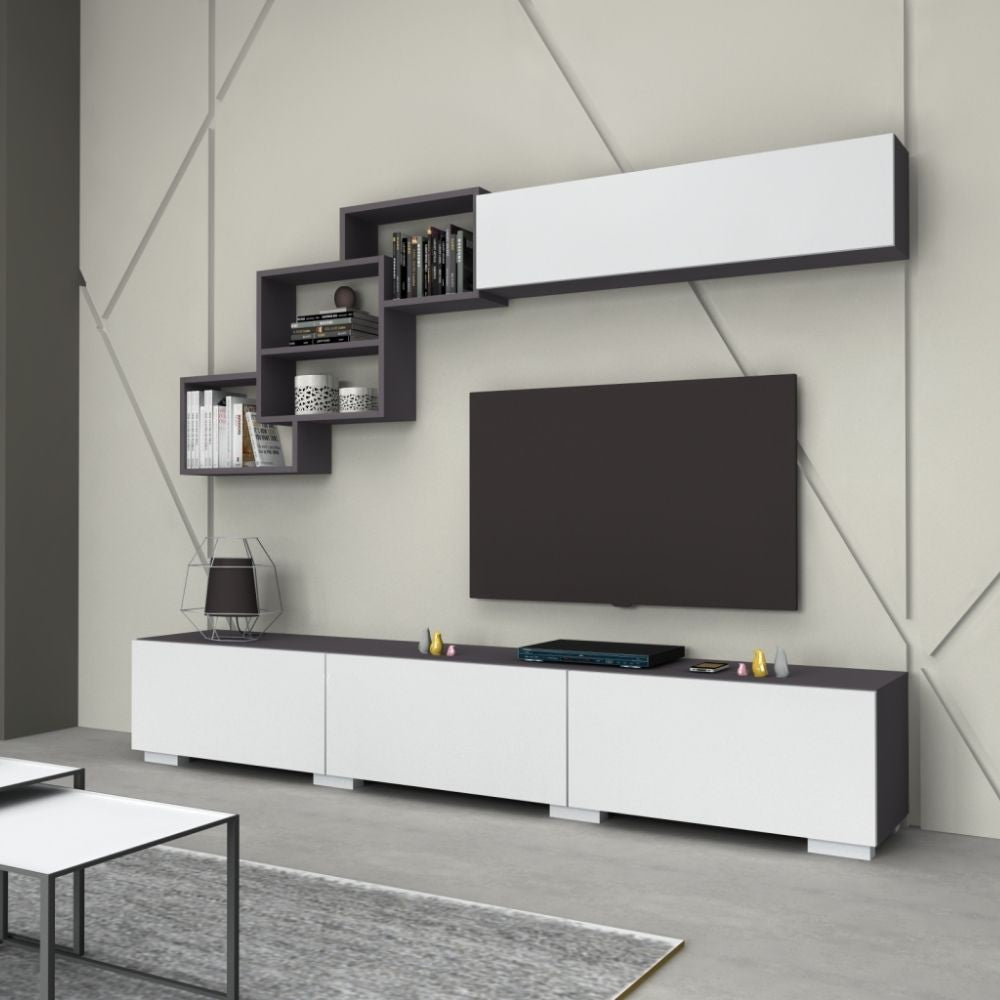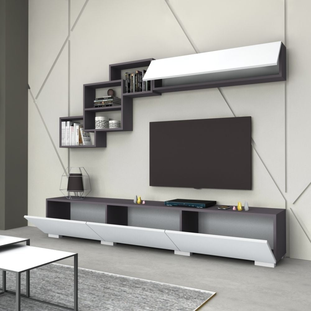 Parete attrezzata per arredare in modo elegante e funzionale il tuo soggiorno o salotto. Lunga base porta Tv a tre ribalte. Tre elementi a giorno intersecati tra di loro. Comodo pensile a ribalta.