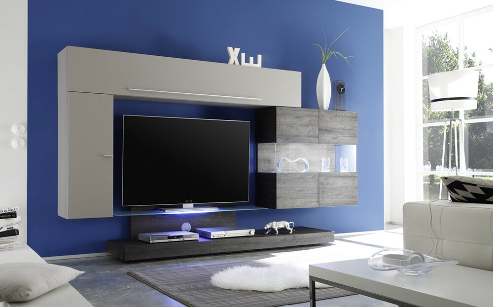 Parete Attrezzata Mobili Salotto 3 Mobili Sospesi 1 Mobile TV 275x50x180cm TFT Line Peltro Opaco Grigio Quercia