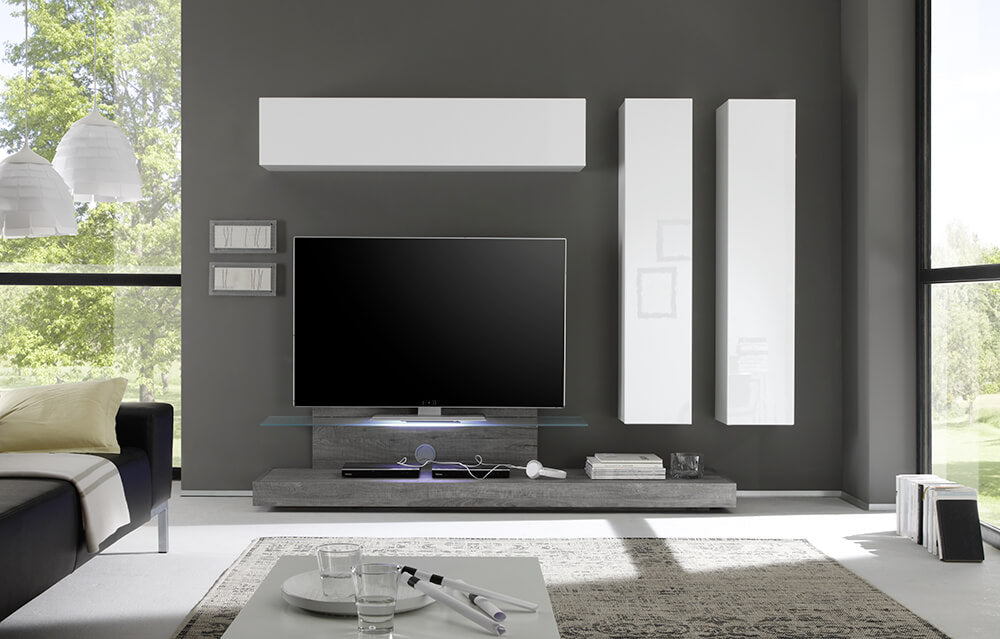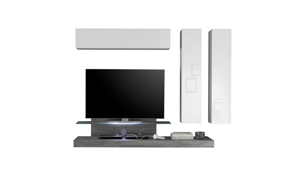Parete Attrezzata Mobili Salotto 3 Mobili Sospesi 1 Mobile TV Mensola 185x225x51cm TFT Cube Bianco Lucido e Quercia Grigio