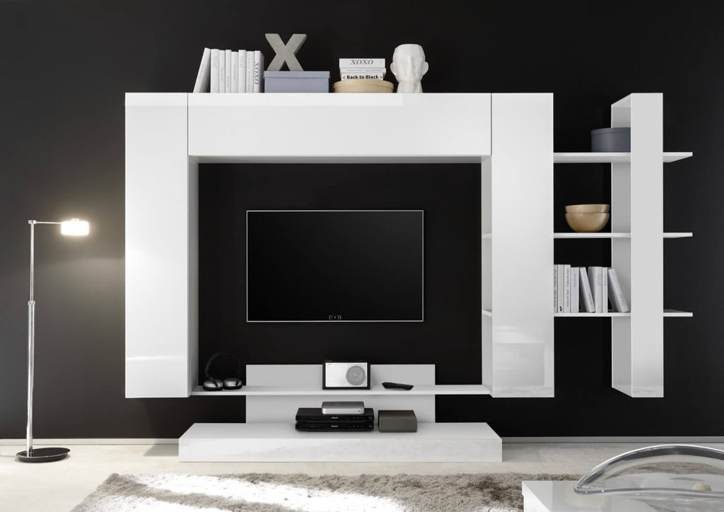 Parete Attrezzata Mobili Soggiorno 2 Pensili 1 Mobile TV 1 Libreria in Melaminico 259x40x175cm TFT Nico Bianco