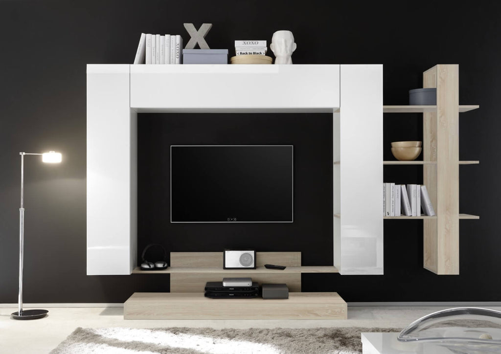 Parete Attrezzata Mobili Soggiorno 2 Pensili 1 Mobile TV 1 Libreria in Melaminico 259x40x175cm TFT Nico Bianco Rovere