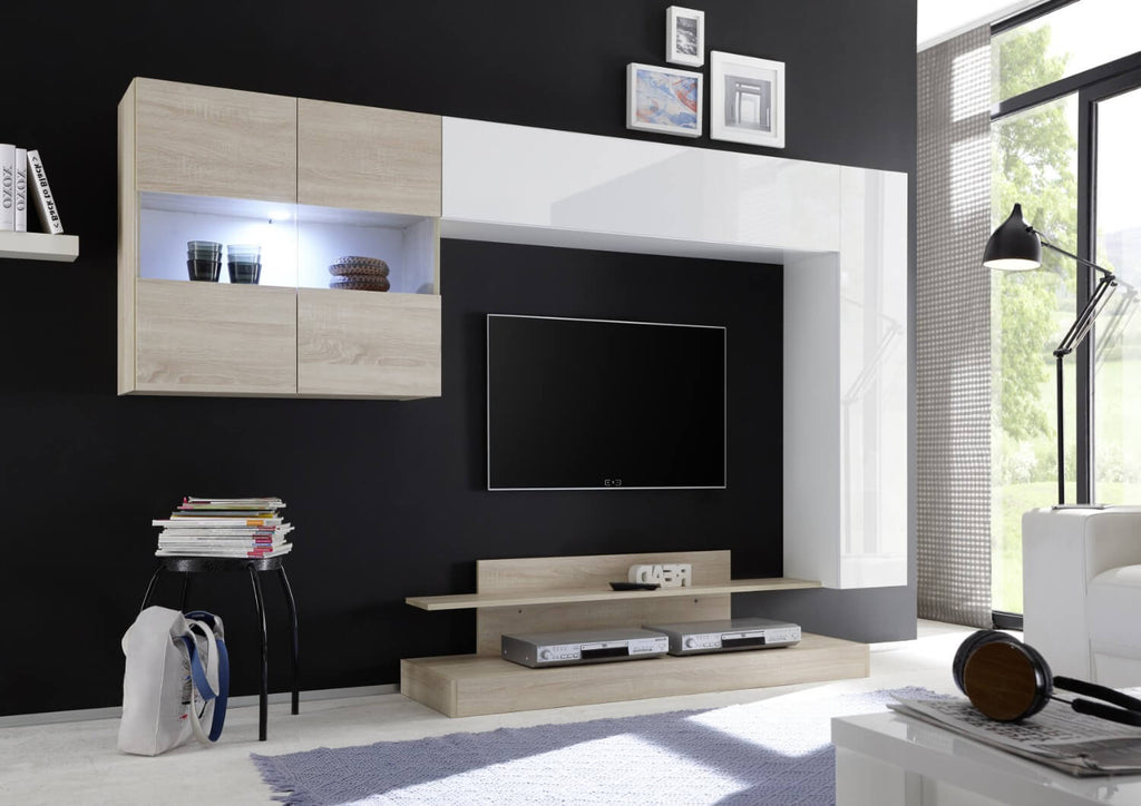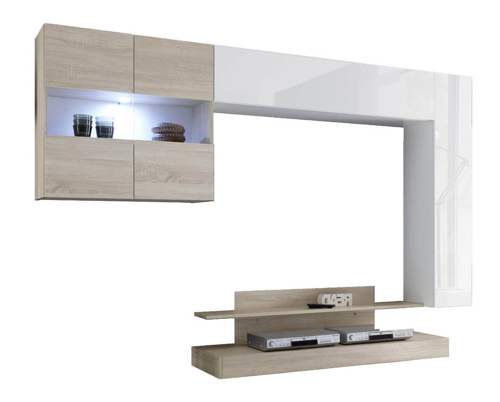 Parete Attrezzata Mobili Soggiorno 2 Pensili 1 Mobile TV 1 Vetrina in Melaminico 248x40x175cm TFT Nico Bianco Rovere