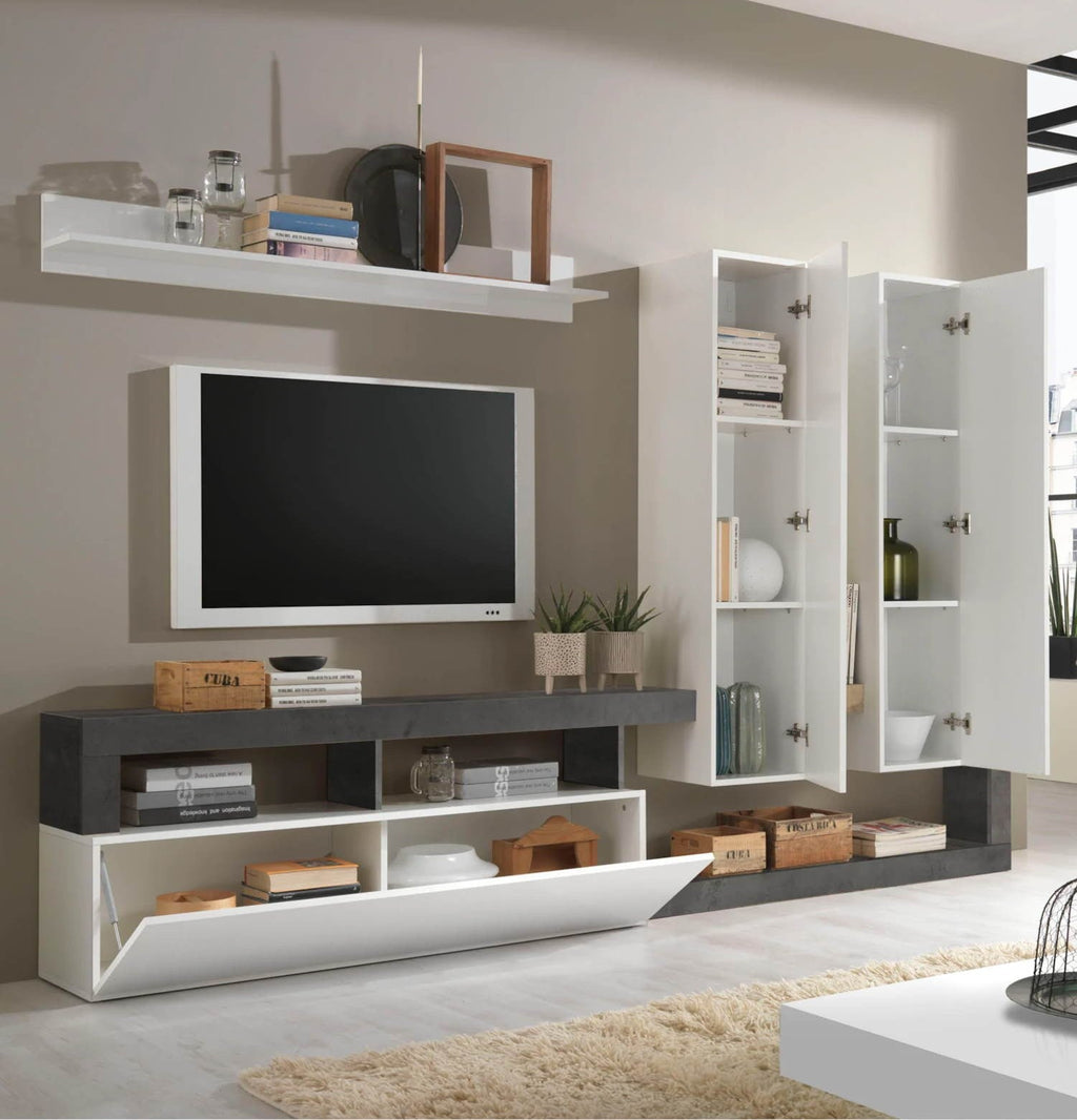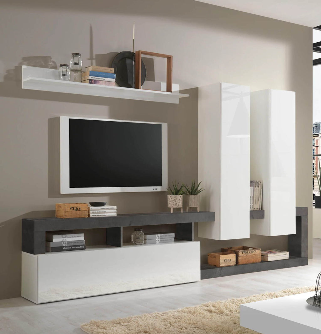 Il soggiorno Mogol è caratterizzato dal moderno design italiano. Una riuscita combinazione di colori con elementi bianchi, frontale in laccato lucido combinato con una cornice colore Ossido.