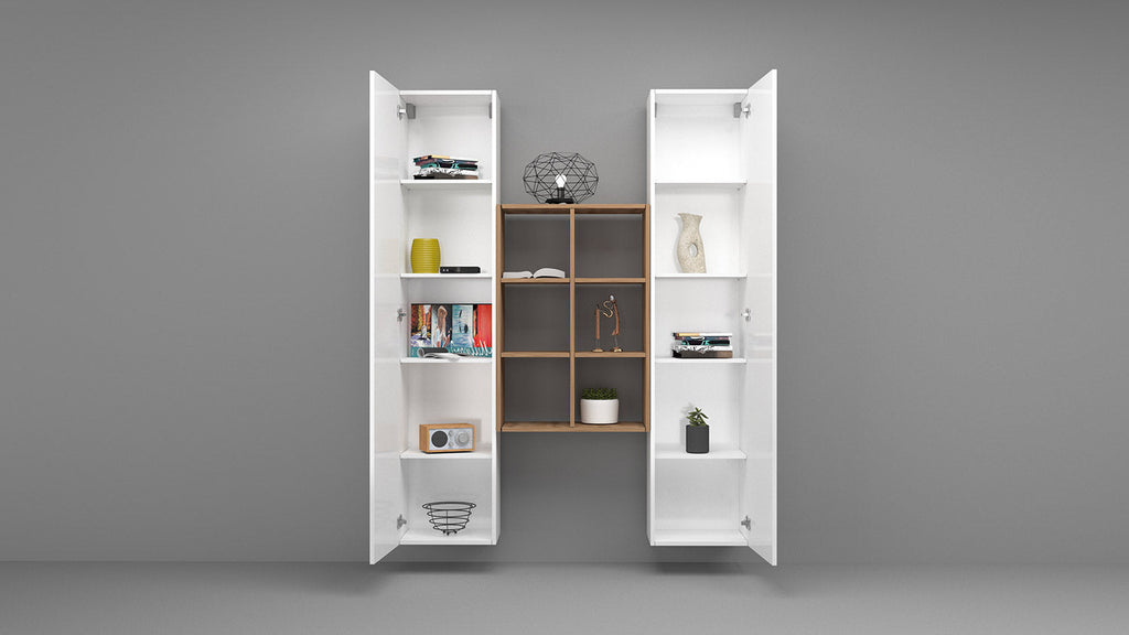 Il soggiorno MARUSKA n°22 da 140 cm è caratterizzato da una parete formata da 2 colonne armadio e una libreria 6 vani. La parete del soggiorno può essere montata sia a terra che appesa, la colonna armadio invece, è composta da 1 anta battente, con all’interno 4 ripiani in legno. Tutti i mobili che compongono il soggiorno sono realizzati in melaminico bianco laccato lucido o antracite opaco, eccetto la libreria, caratterizzata dal legno rovere wotan. Il soggiorno MARUSKA n° 22, è adatto a qual sia si tipo di arredamento della stanza, grazie alla sua forma moderna. Nella confezione è contenuto anche un kit di montaggio con istruzioni da seguire molto semplici.