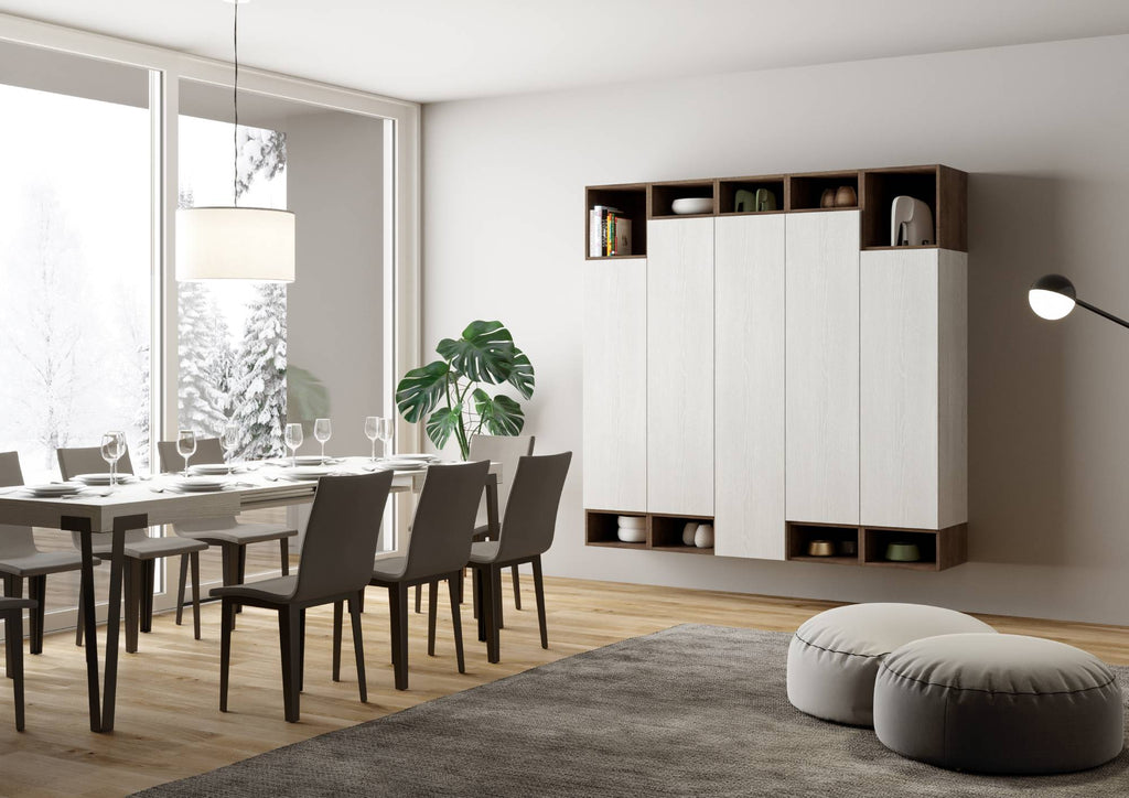 La parete attrezzata Isoka A35 è composta principalmente da elementi verticali, ed è resa più sfiziosa dalla presenza dei cubi aperti.
